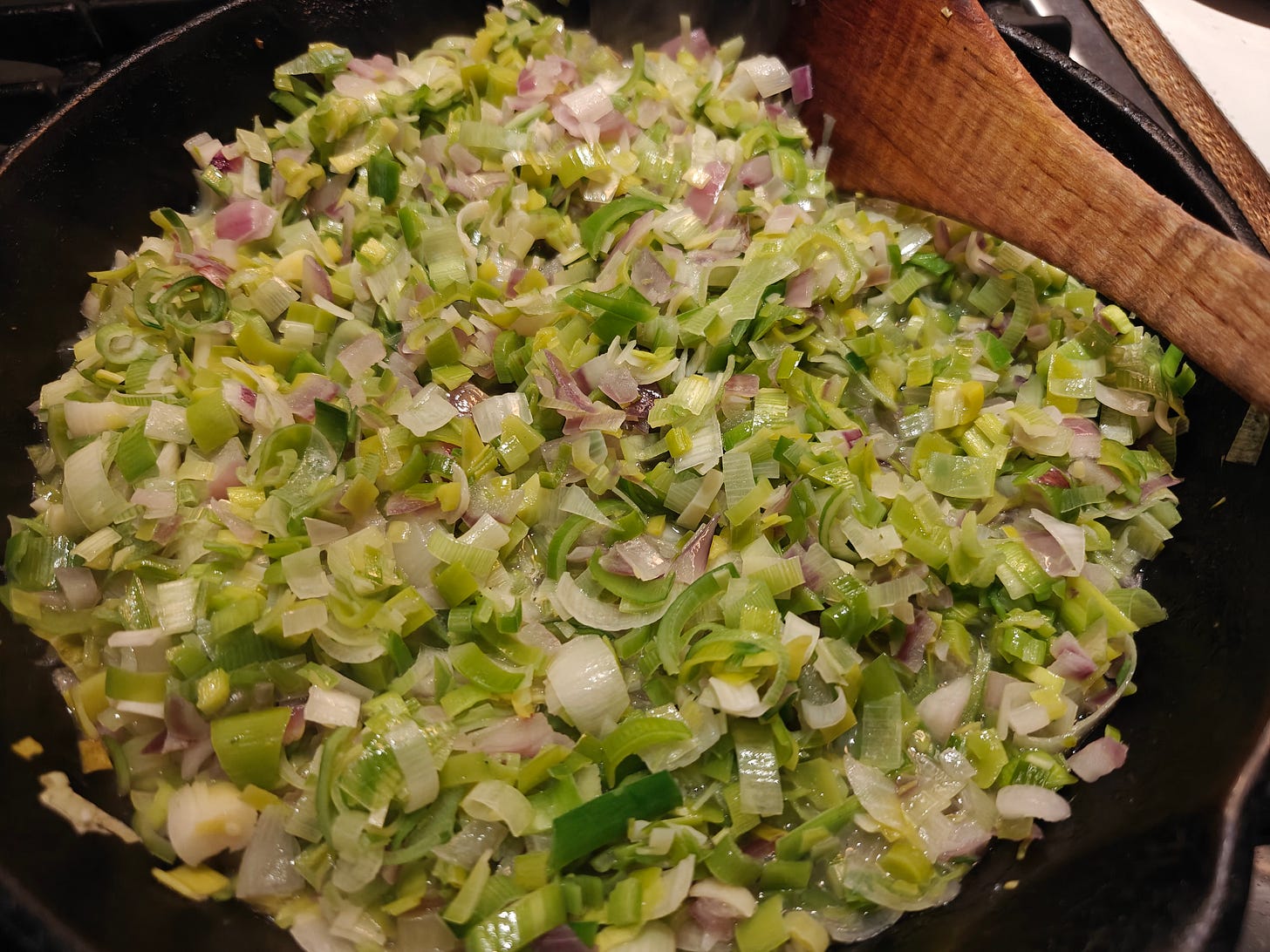 chopped leeks with a little chopped red onion, pre-cooking before going into the pie