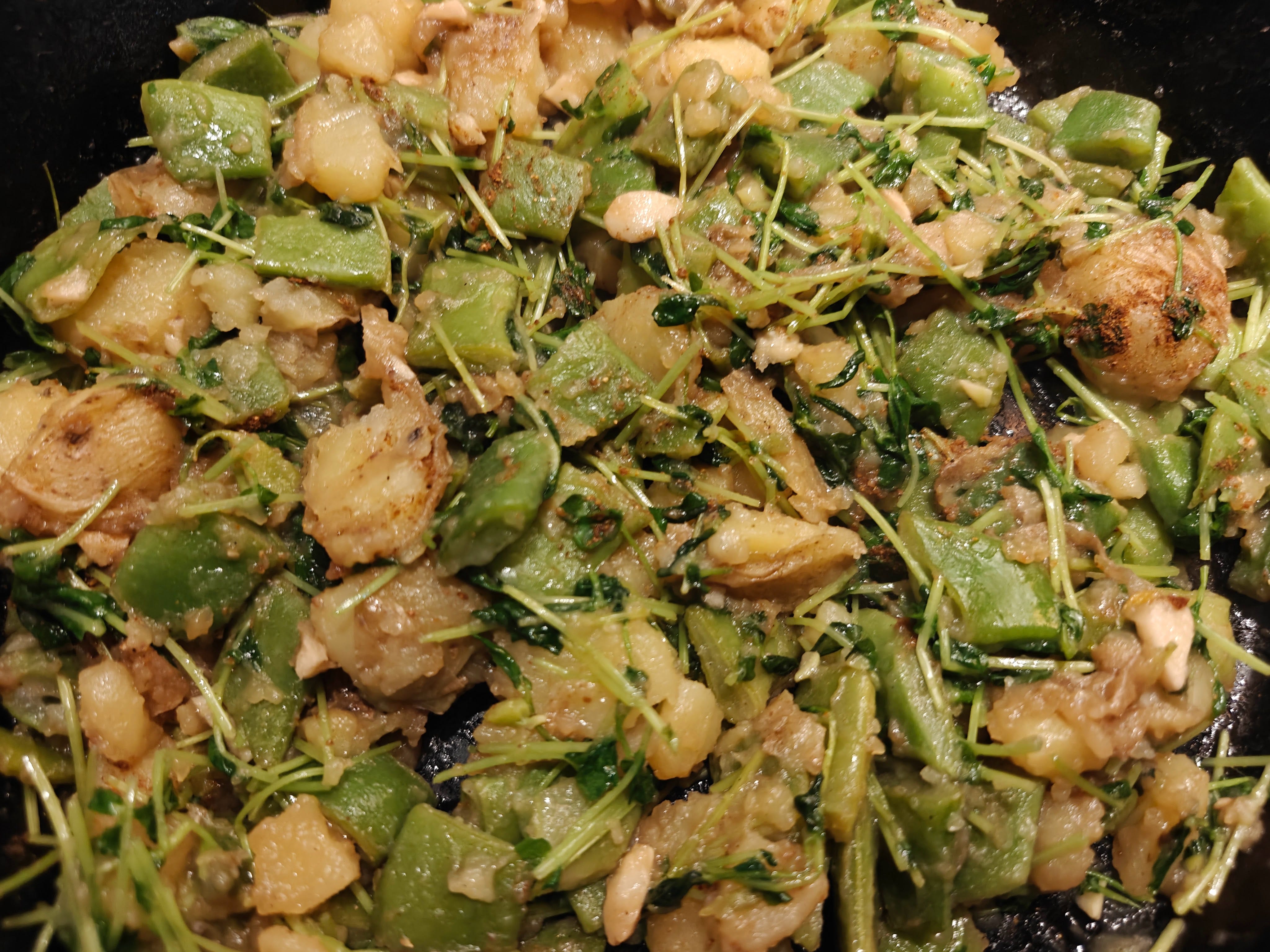 My first skillet-cooked flat beans with potatoes from two weeks ago, with a scattering of tender pea shoots on top