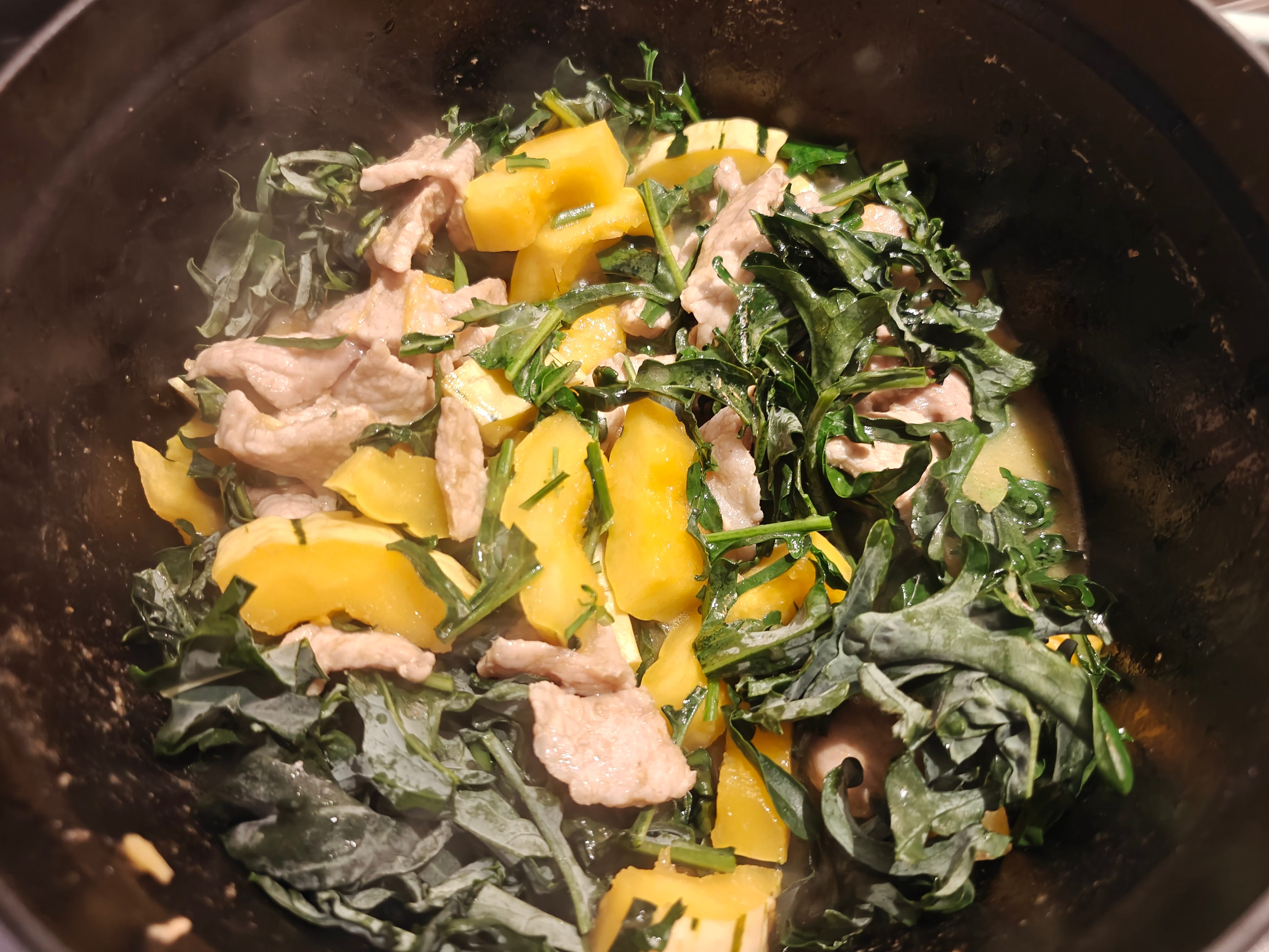 You could use mushrooms as your flavour base instead of the chicken or pork; you could include slices of firm tofu, or corn kernels cut from the cob; and of course if you have any washed chopped greens (for example radish greens, spinach, arugula, spigarello) you could toss them partway through (spinach needs little time, spigarello needs a good fifteen minutes).