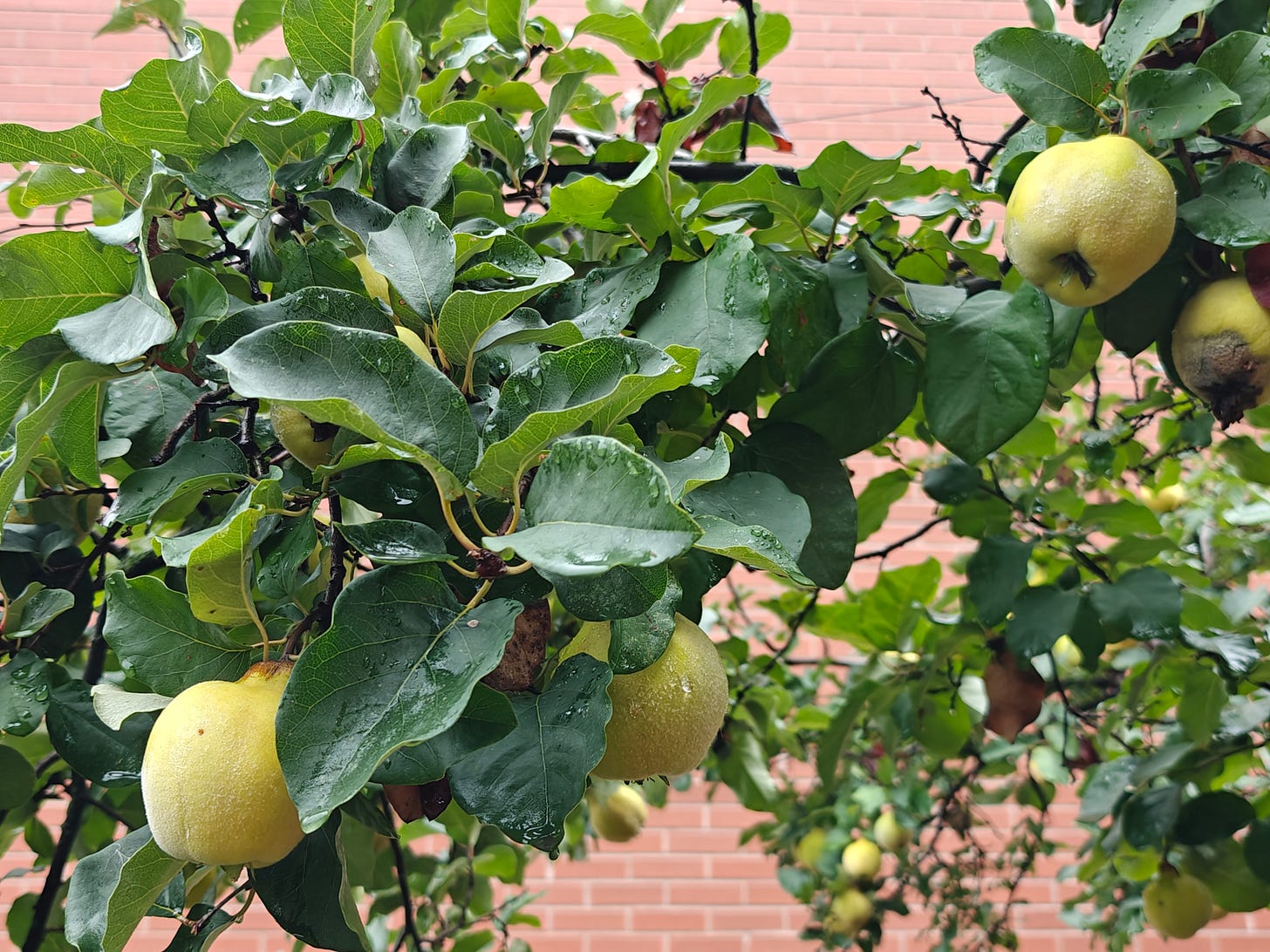 Out walking today in the west Annex I came on a quince tree, a rare sight here, loaded with fruit, next to a well-tended patch of tomato plants. Autumn has arrived!