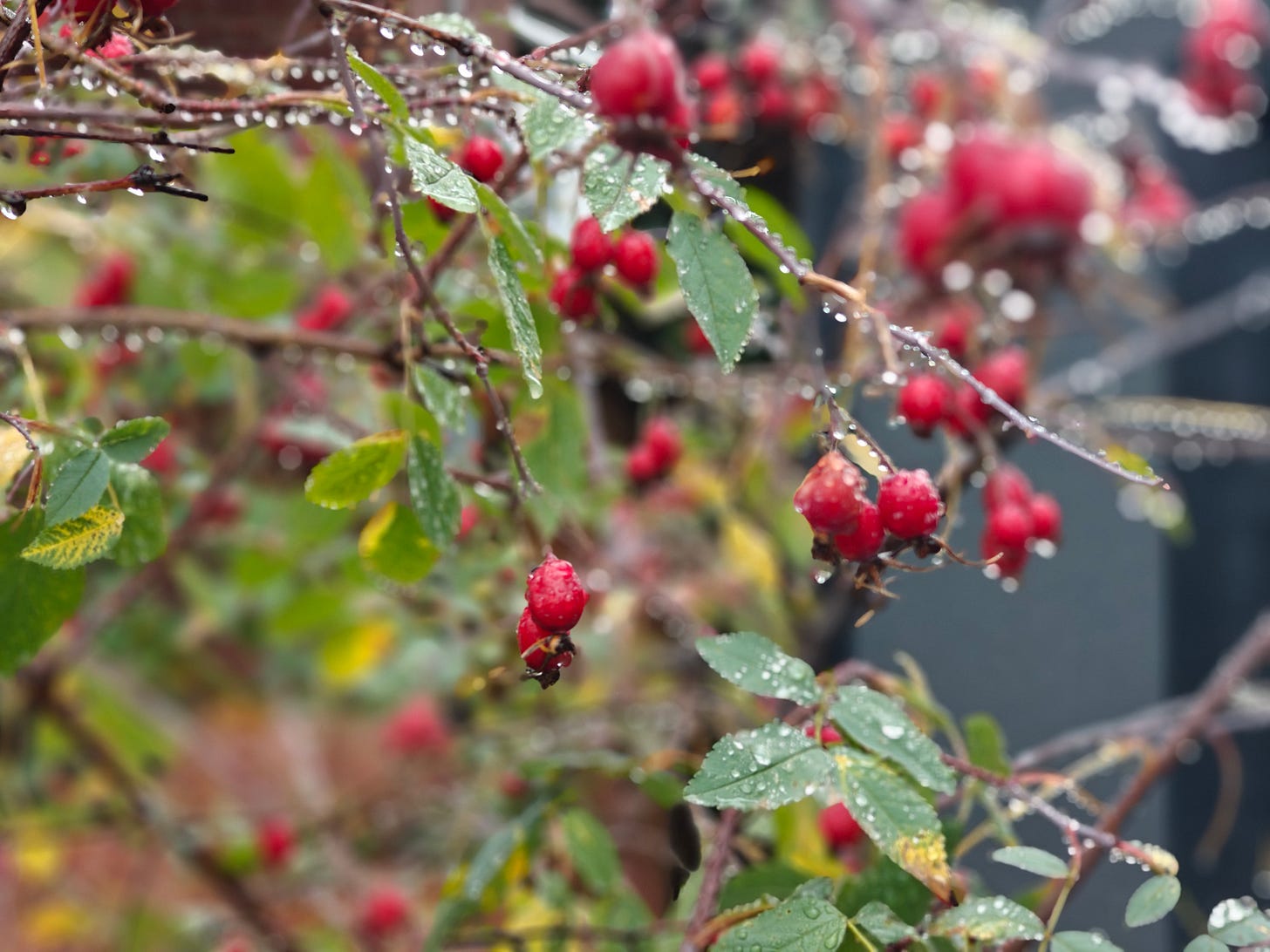 Rosehips and raindrops today. You can almost hear the ground gulping down the rain after the dry summer we’ve had. Happy new moon to all.