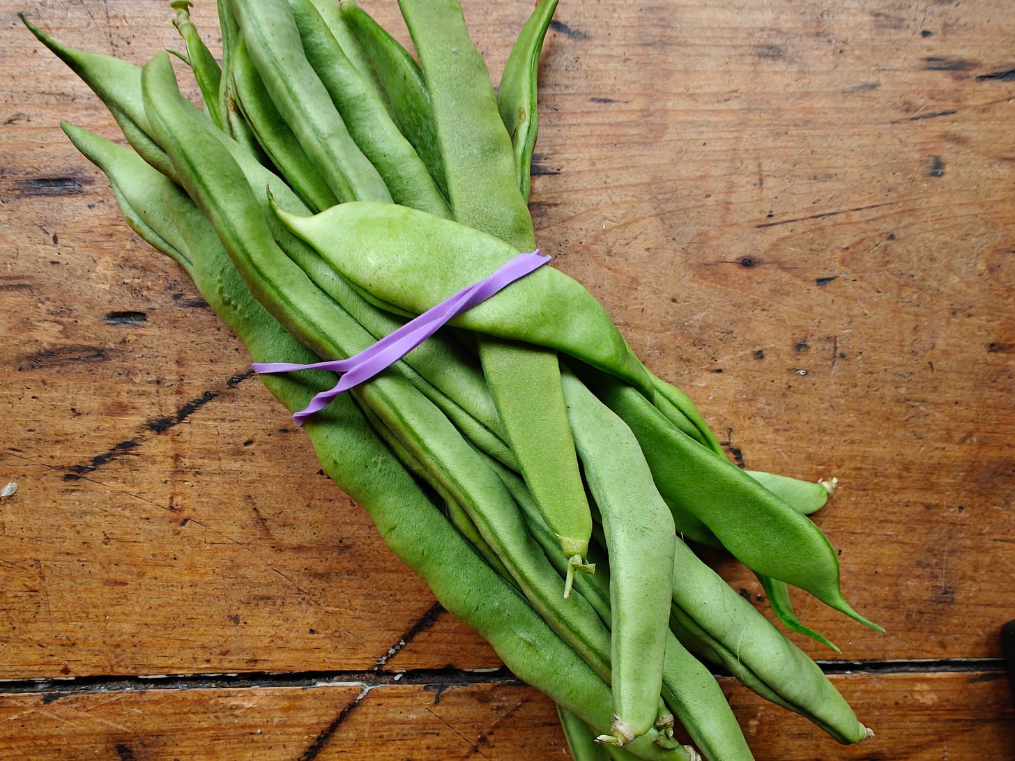 At the Tuesday market I go to, at Trinity Bellwoods park in Toronto, a vendor named Lily (whom I mentioned last week) has flat beans, sold in a bundle with an elastic around it