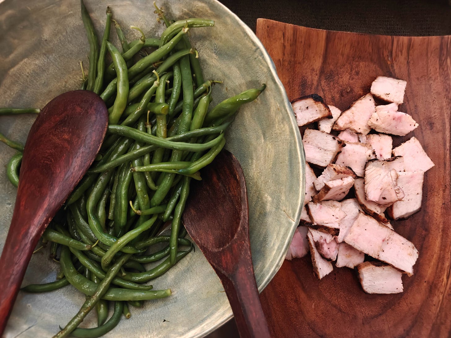 Green beans simply parboiled but left firm, dressed with a light vinaigrette; best eaten with the fingers like asparagus, so then there’s no need to trim them before cooking