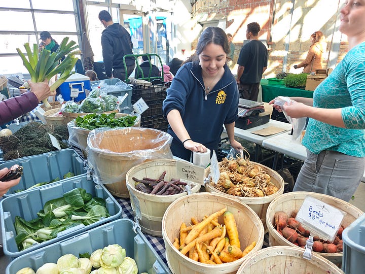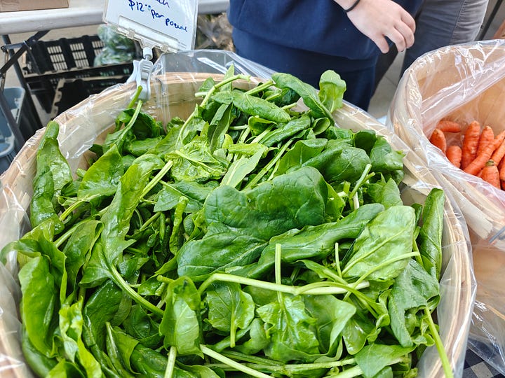 offerings from Footsteps Farm at Wychwood Farmers’ Market a week ago: fresh spinach by the handful, and an array of winter-stored vegetables too