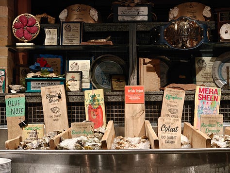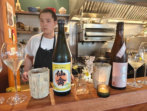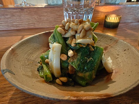 oysters at Rodneys (the relatively large Cotuits (from Massachusetts) were a lovely surprise and the Merasheen Bays (from Newfoundland) were also new to me); two shots from the fabulous Mhel: chef Young Hoong Ji with our sake choices, and one of his brilliant small dishes, mustard greens with flavoured miso and yari ika, topped with pine nuts