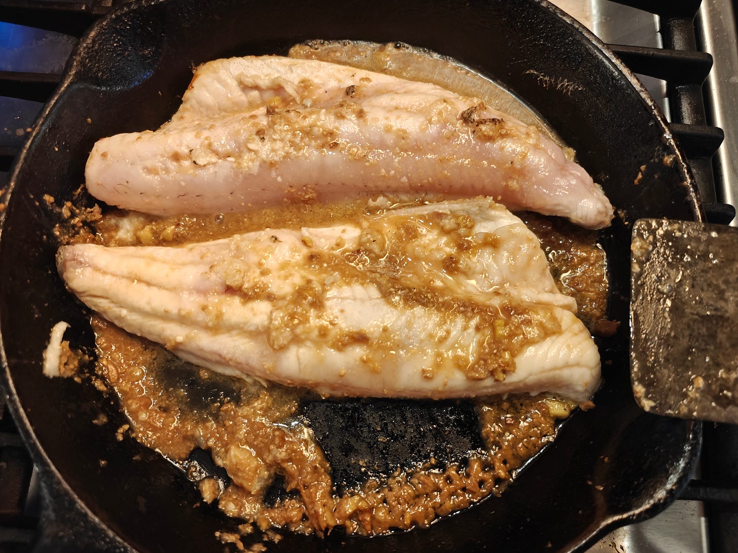 The fish fillets were long, so I needed to use my widest cast-iron skillet. It went over medium heat, then in went a small amount of olive oil, just to coat the pan, plus the minced ginger. Once it was hot, I added the fillets skin side down for about a minute, then flipped them and cooked the flesh side on the pan for a bare half minute. I flipped them back, poured on the miso liquid, and covered the pan. After a couple of minutes I lifted the lid and spooned some of the broth over the fish, then covered it again. Less than a minute later they were done and could be transferred to a wide dish with their cooking broth.