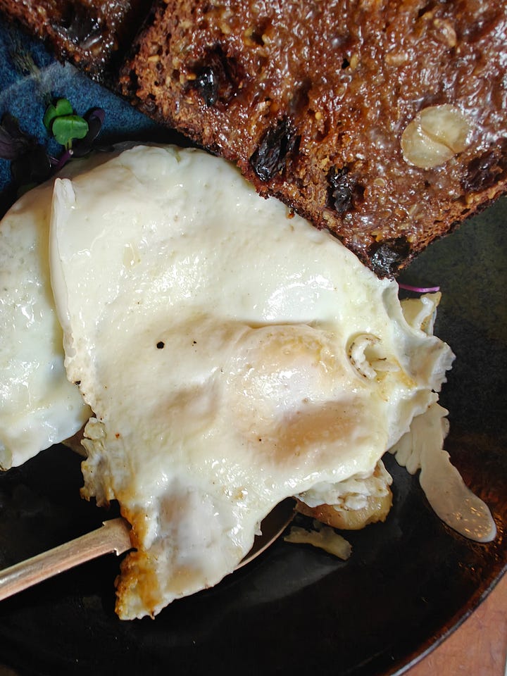 olive oil-fried eggs over leftover potatoes, with the leftover fresh chutney; and on the right butter- fried eggs with toasted hazelnut rye from Evelyns Crackers