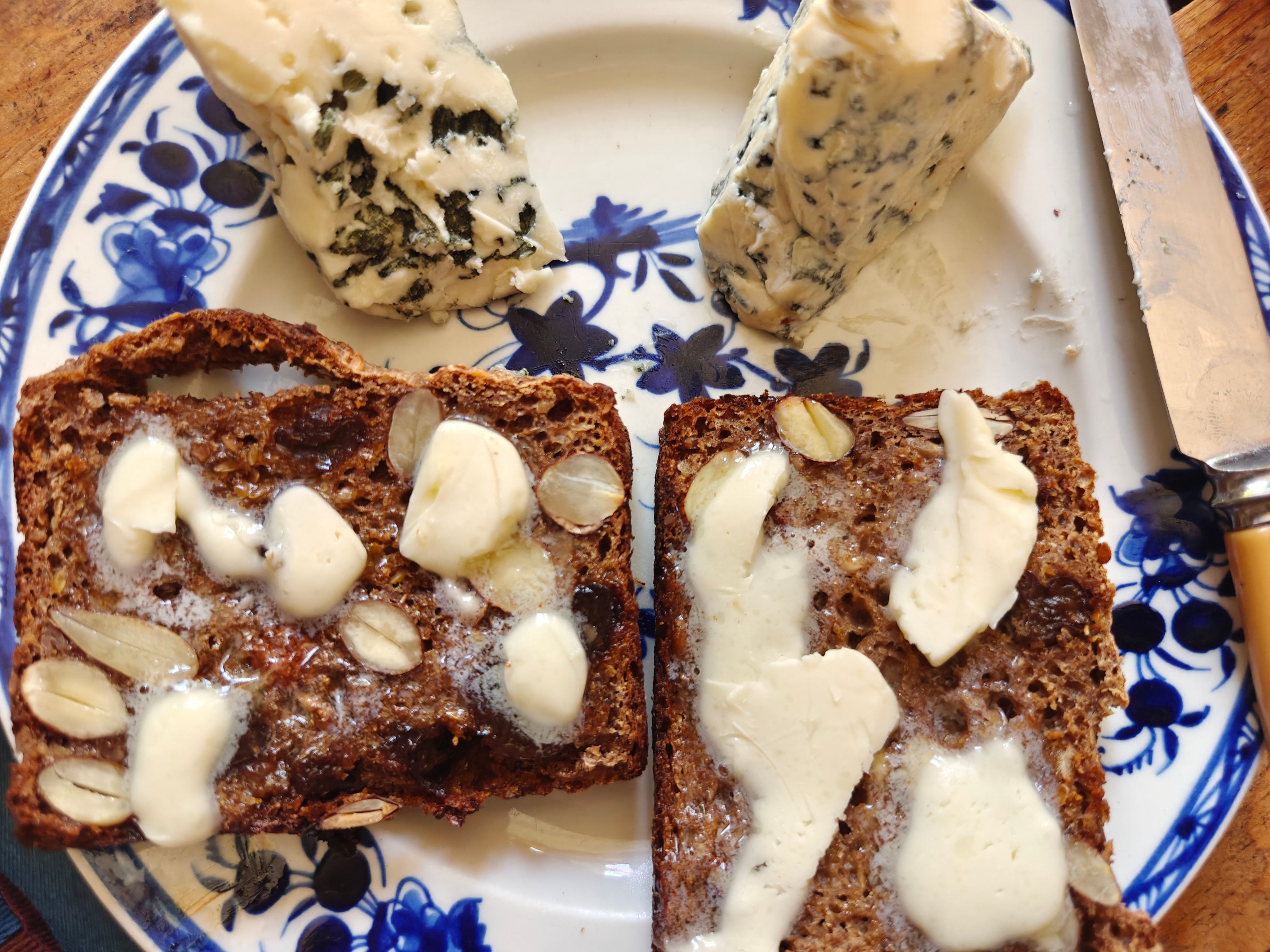 an over-the-top luxurious meal of Dawn’s bread toasted, with loads of her home-made butter, plus two blue cheeses: organic Roquefort on the left and St Agur on the right. A lot to be thankful for.
