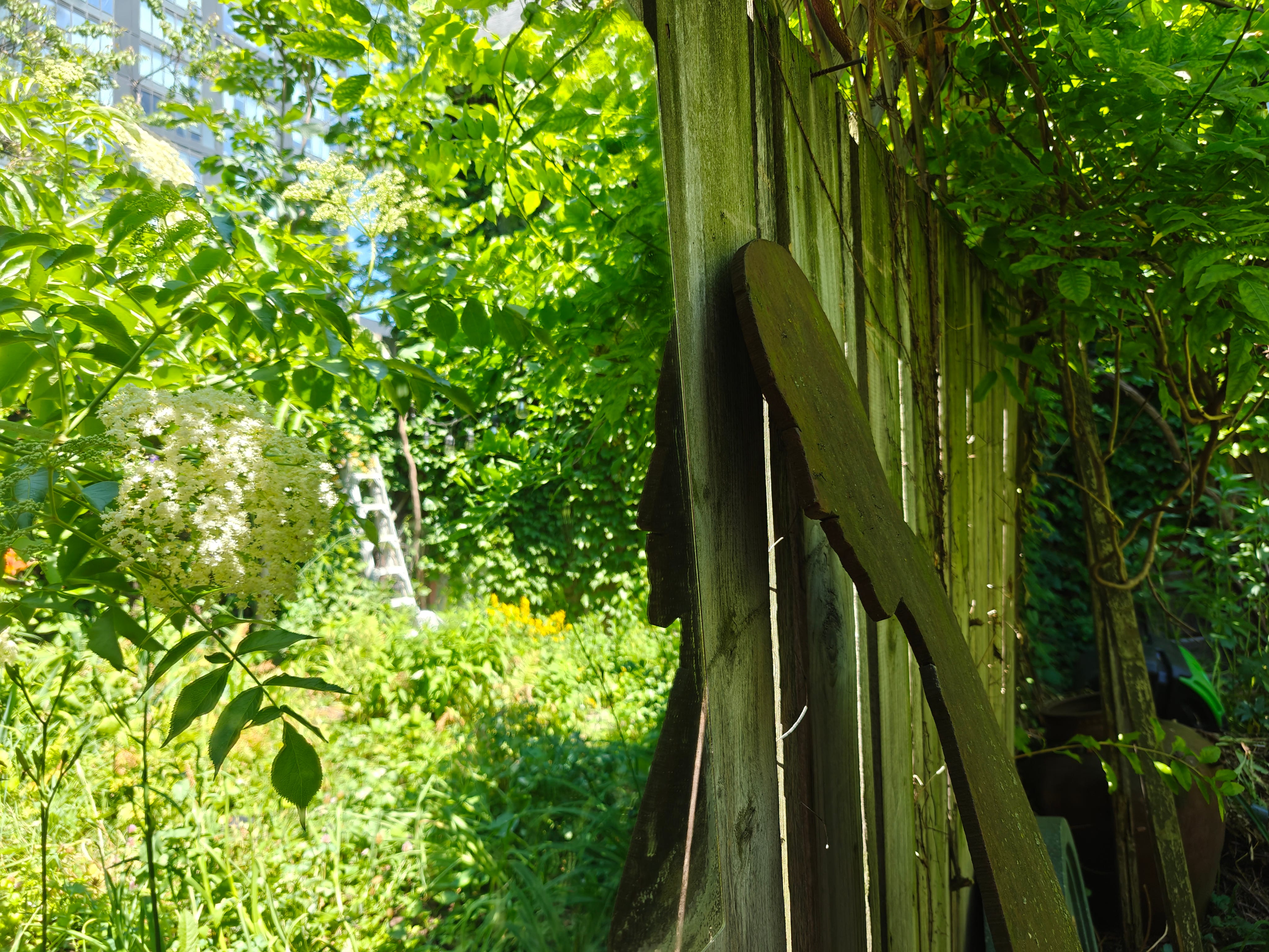 reflections in a mirror of the garden aglow; and part of Miho Sawada’s steel figure leaning on the fence