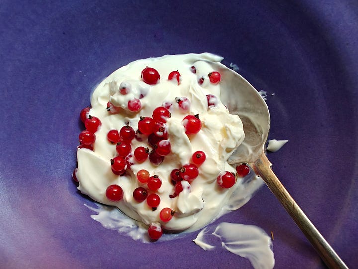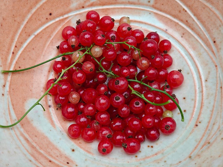 On the tart-acid front, and following last week’s mention of the berries ripening now, I picked the small collection of red currants on my little bush in the garden. They were beautiful, and delicious, eaten with crème fraiche made by my friend Dawn. Pure delight.