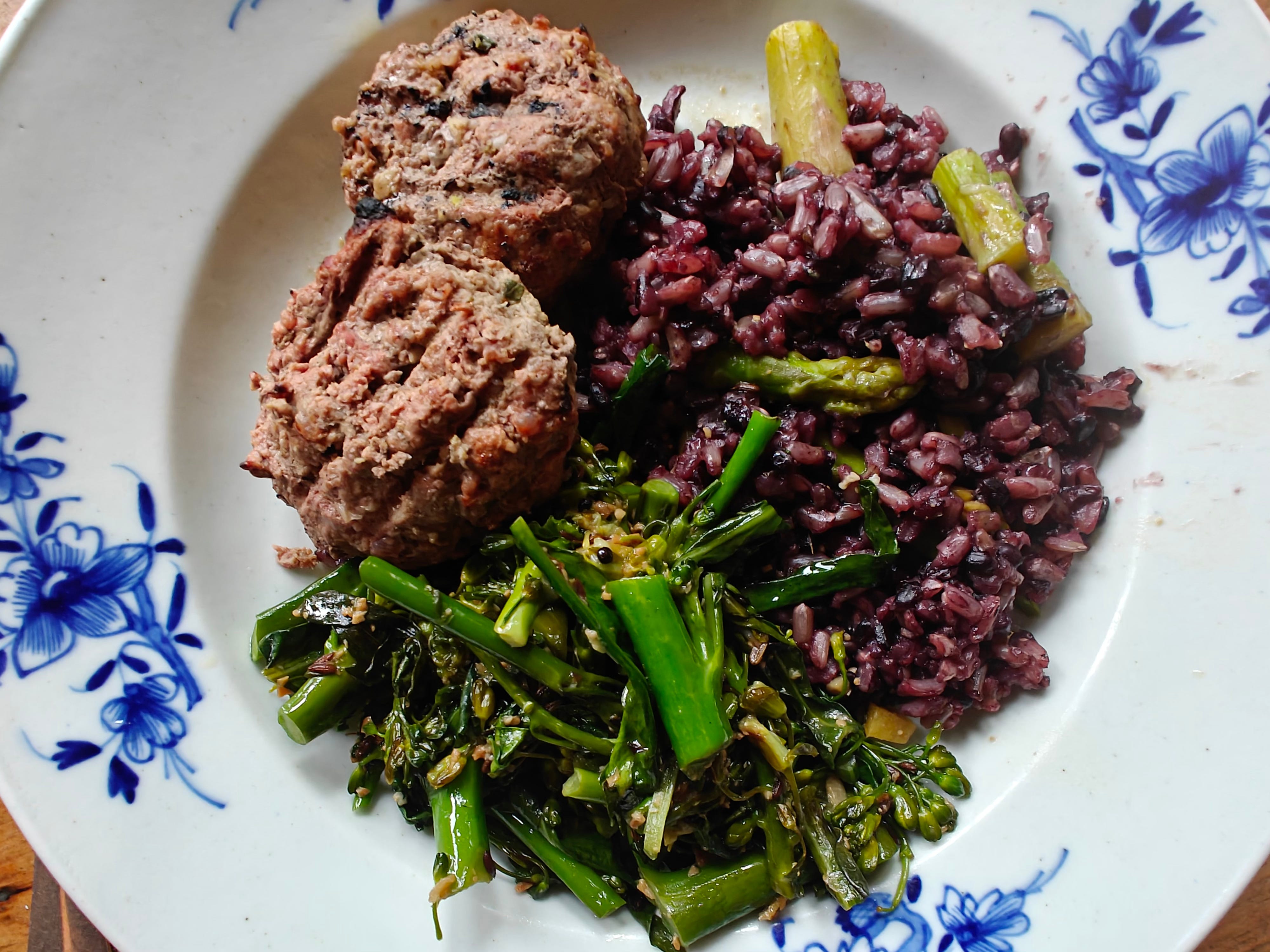 the reheated burgers, blended cooked rice with chopped asparagus, and stir-fried broccolini