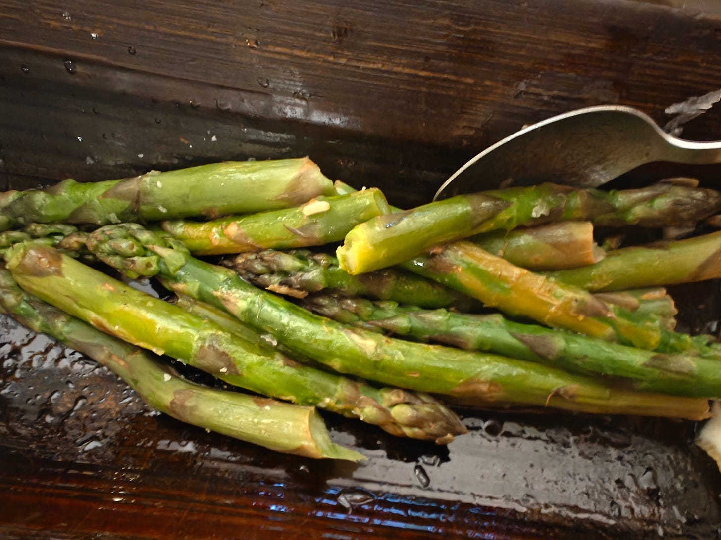 The asparagus cooked quickly in a wide shallow pan of boiling salted water. I always lift it out with tongs into another dry bowl so it’s not carrying water that would dilute the dressing. From there it goes into a wooden serving dish with lemon juice and olive oil, then gets sprinkled with salt.