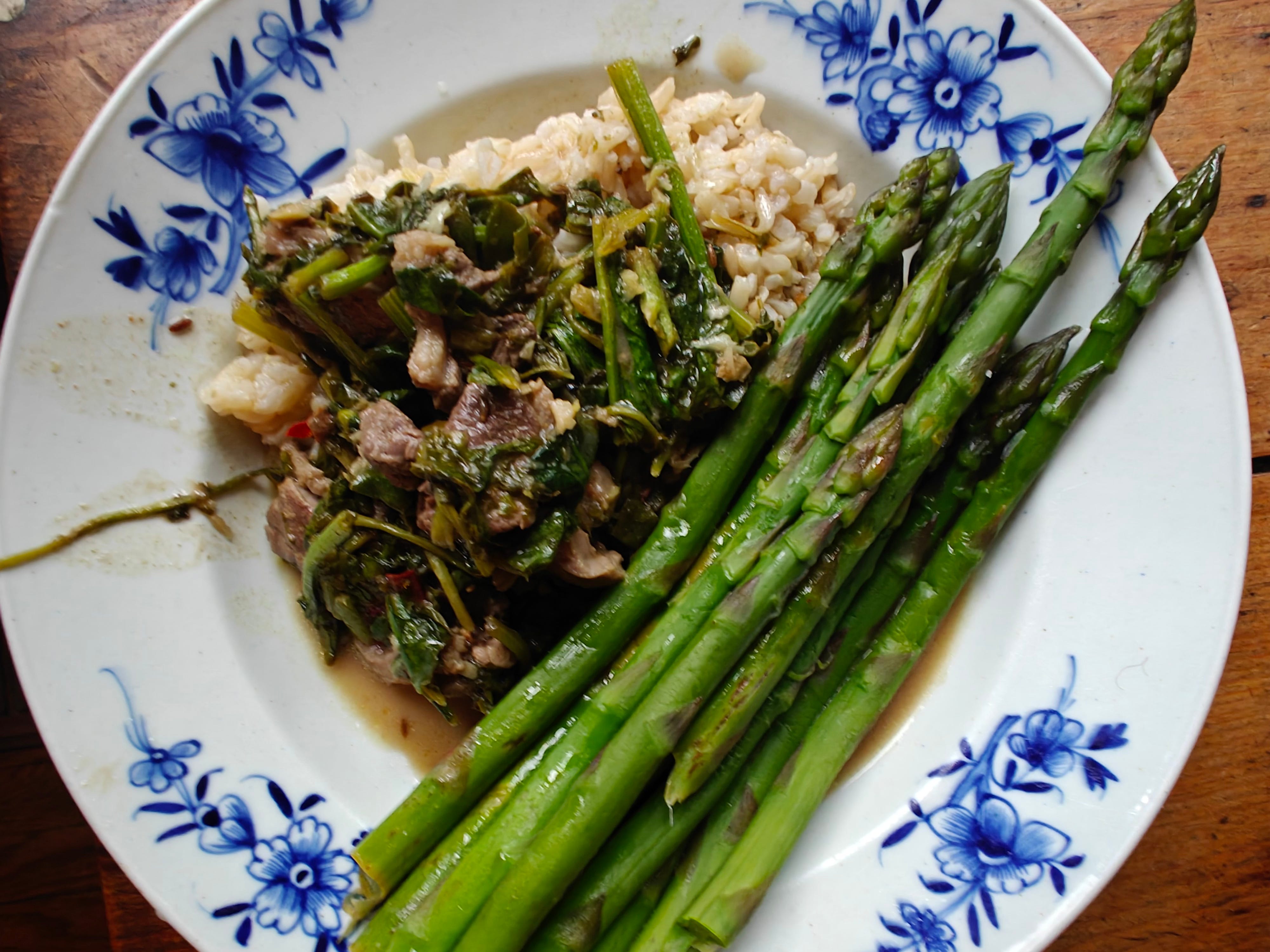 The next night I was in a bit of a rush to make supper for three before heading out to a concert. I put on a pot of brown basmati to cook, then started on the rest: a greens-heavy stir-fry using one boneless duck breast that I’d found in the freezer earlier in the day, plus of course a load of asparagus (we eat it almost every day in this wonderful season that will soon be over, alas).