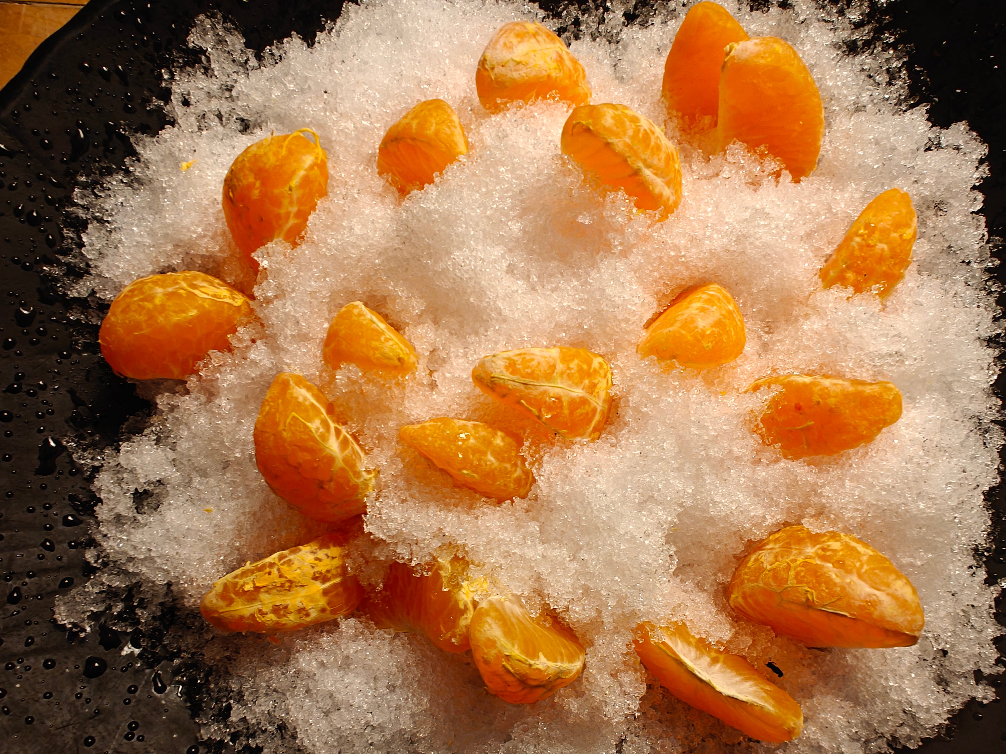 I came across a photo on Instagram recently that showed mandarin orange segments in snow. The writer (who was it?) explained something she’d learned from MFK Fisher’s writing: that if you dry the segments in a warm place, say on a rack over a radiator, so the fine skin dries out to paper thin, and then you place them in snow, they taste extra sweet. I did that today (scraped snow from the back yard into a bowl), and yes they become very sweet and juicy. They’re also pretty splashes of warm colour in the snow, and a consolatory delicious set of bites in this extended cold and snowy winter.