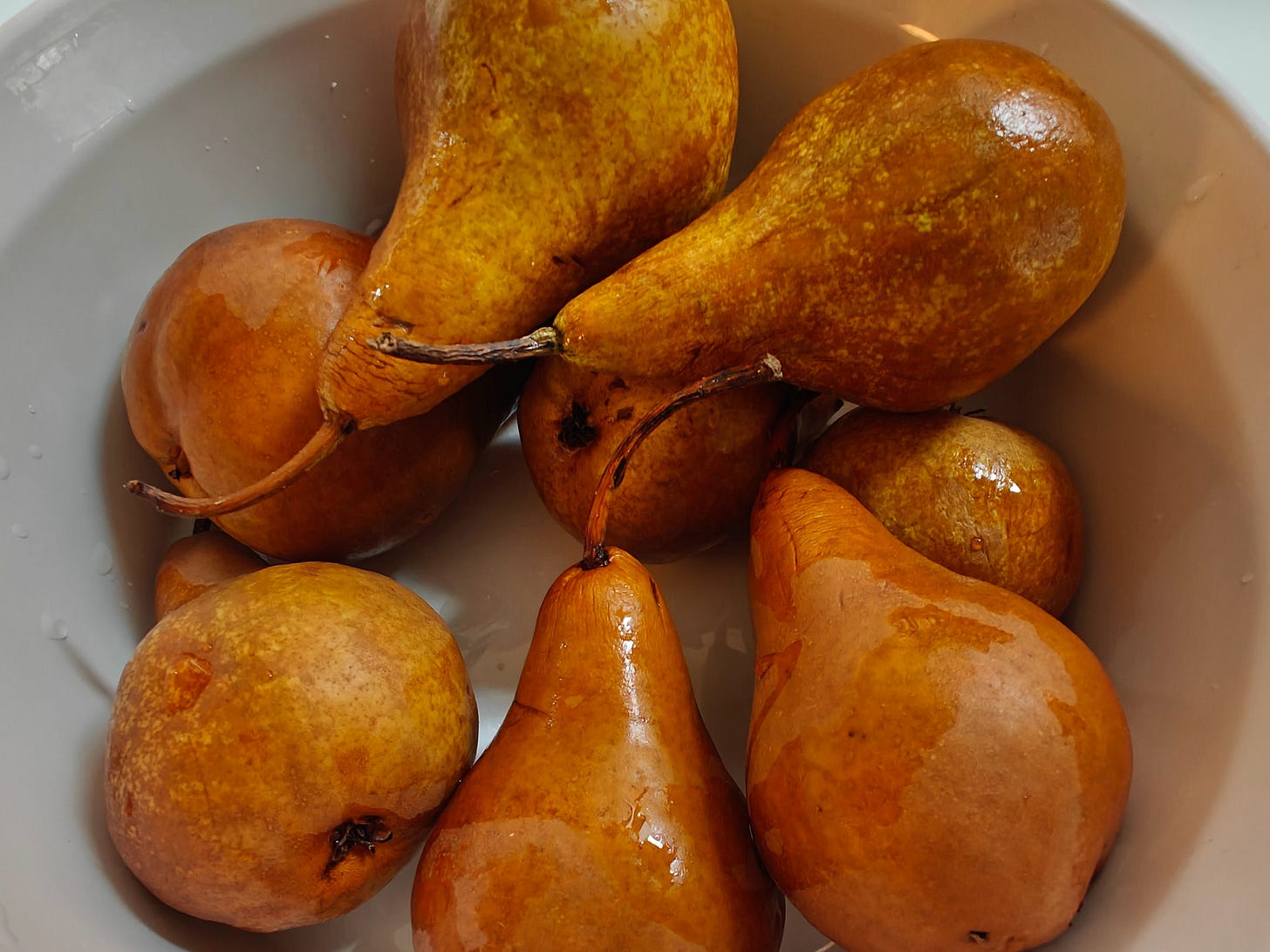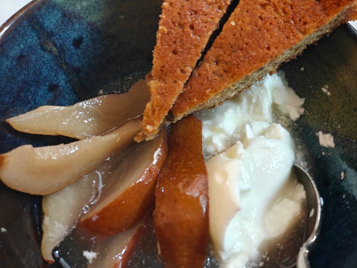 pears in their poaching liquid; breakfast bowl of pear, kefir, and cake wedges
