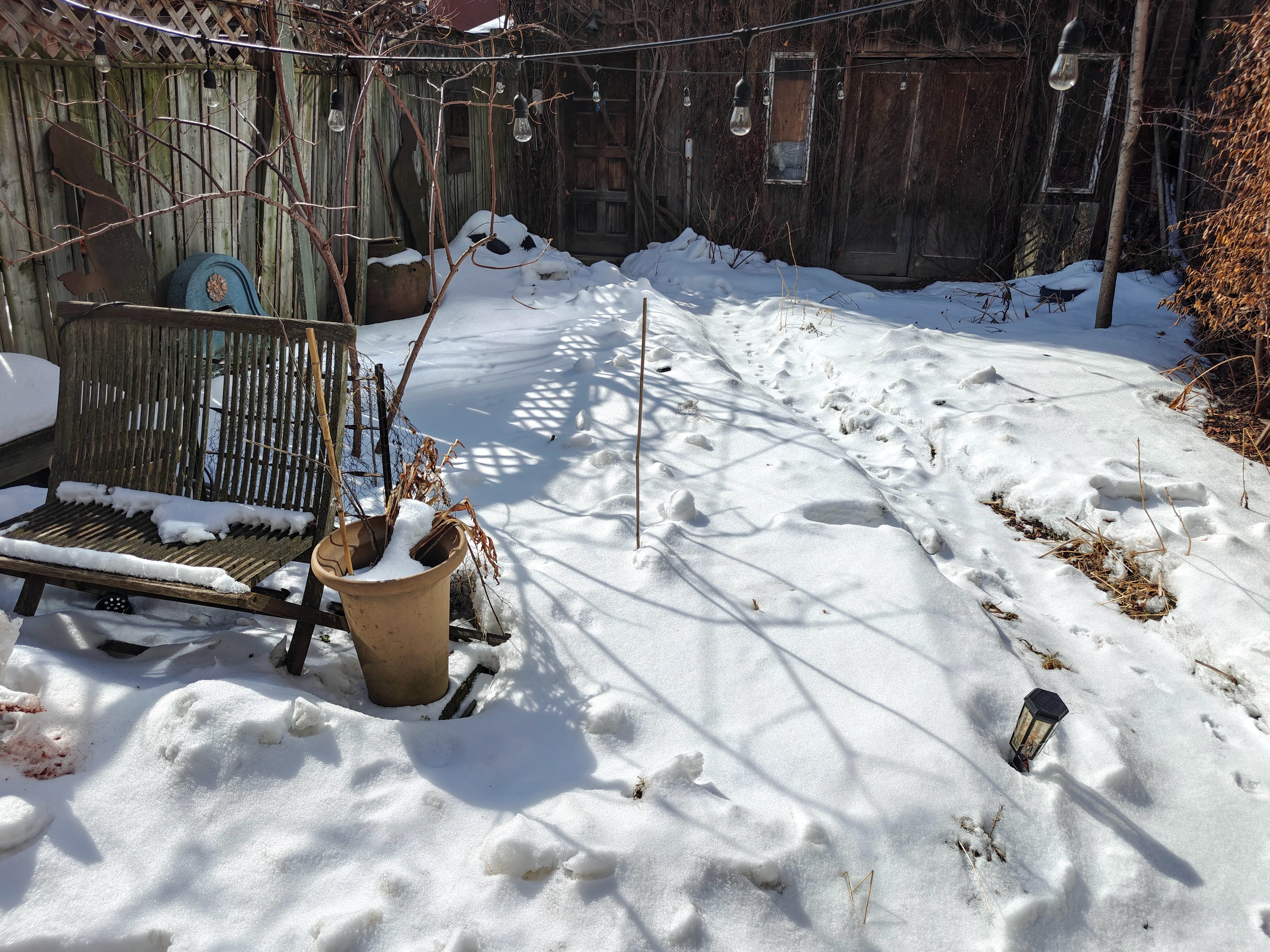 snowy back yard, with sharp shadows and signs of melting