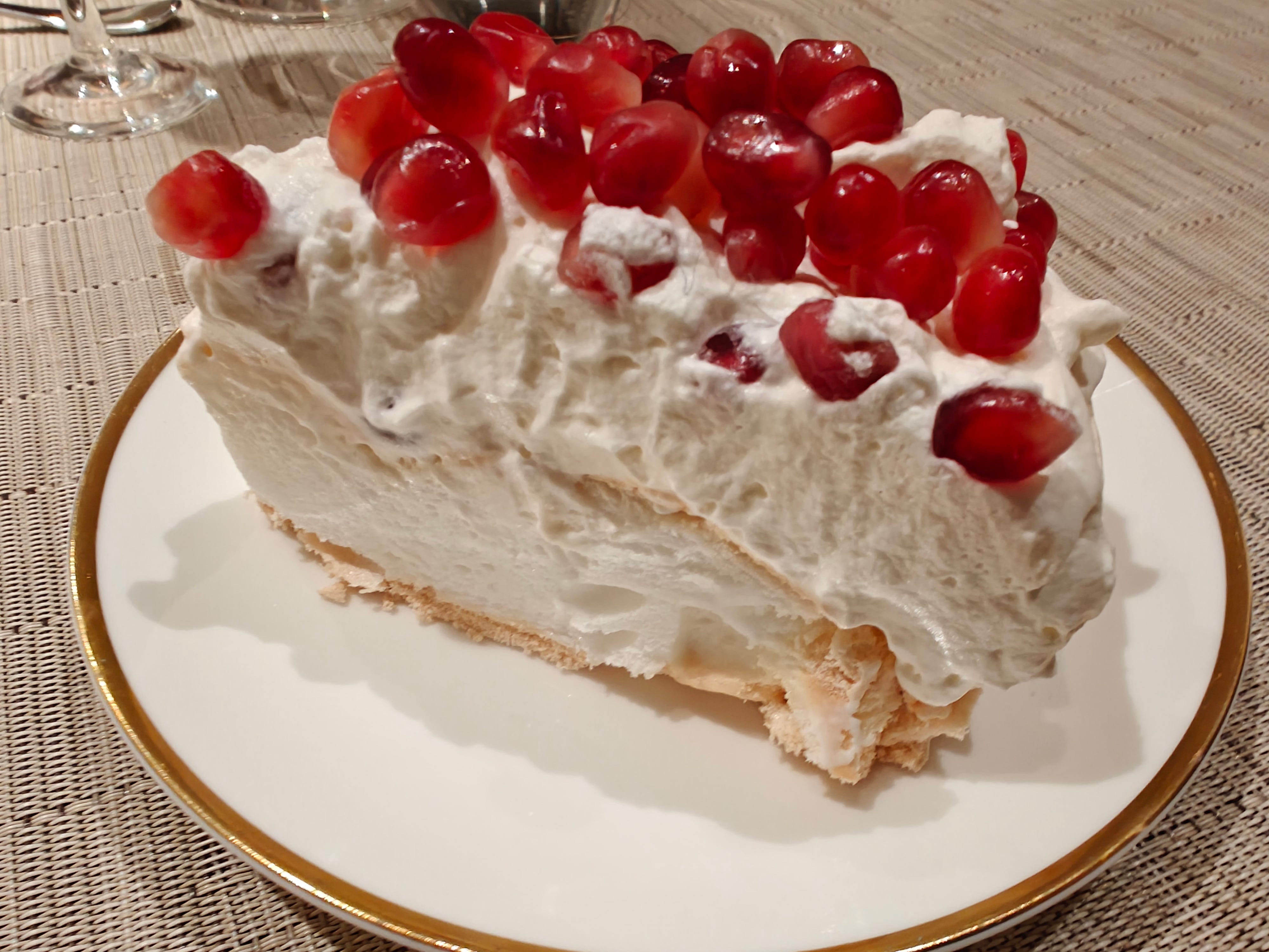 Finally: Last week I had dinner at Jennifer McLagan’s place. She is a brilliant cook and her books are rich with insight, clear excellent recipes, and loads of information. For dessert she made a pavlova topped with pomegranate seeds. Here’s the slice I ate with pleasure!