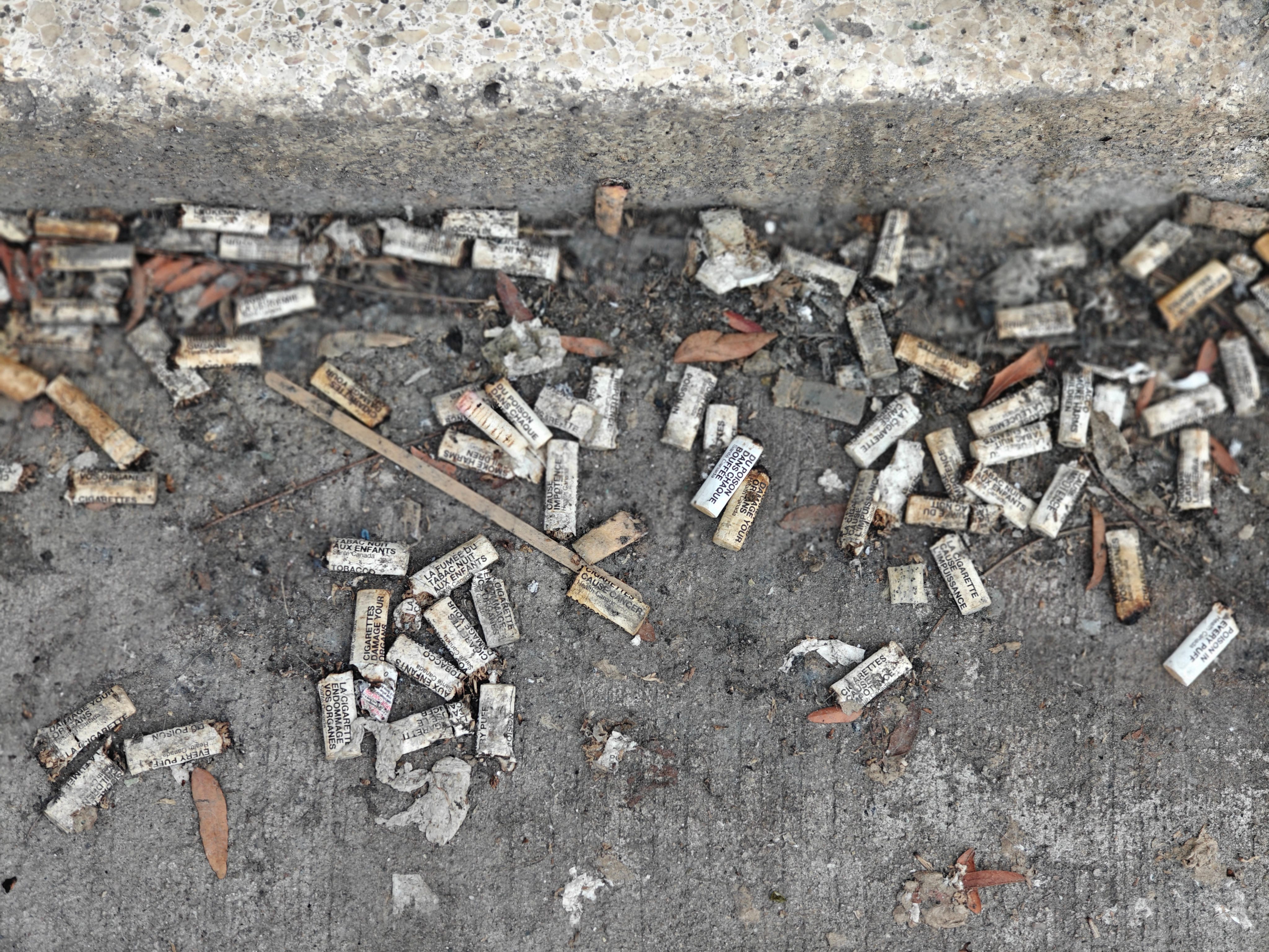 cigarette butts by a doorway on Bloor Street; each is printed with a health warning