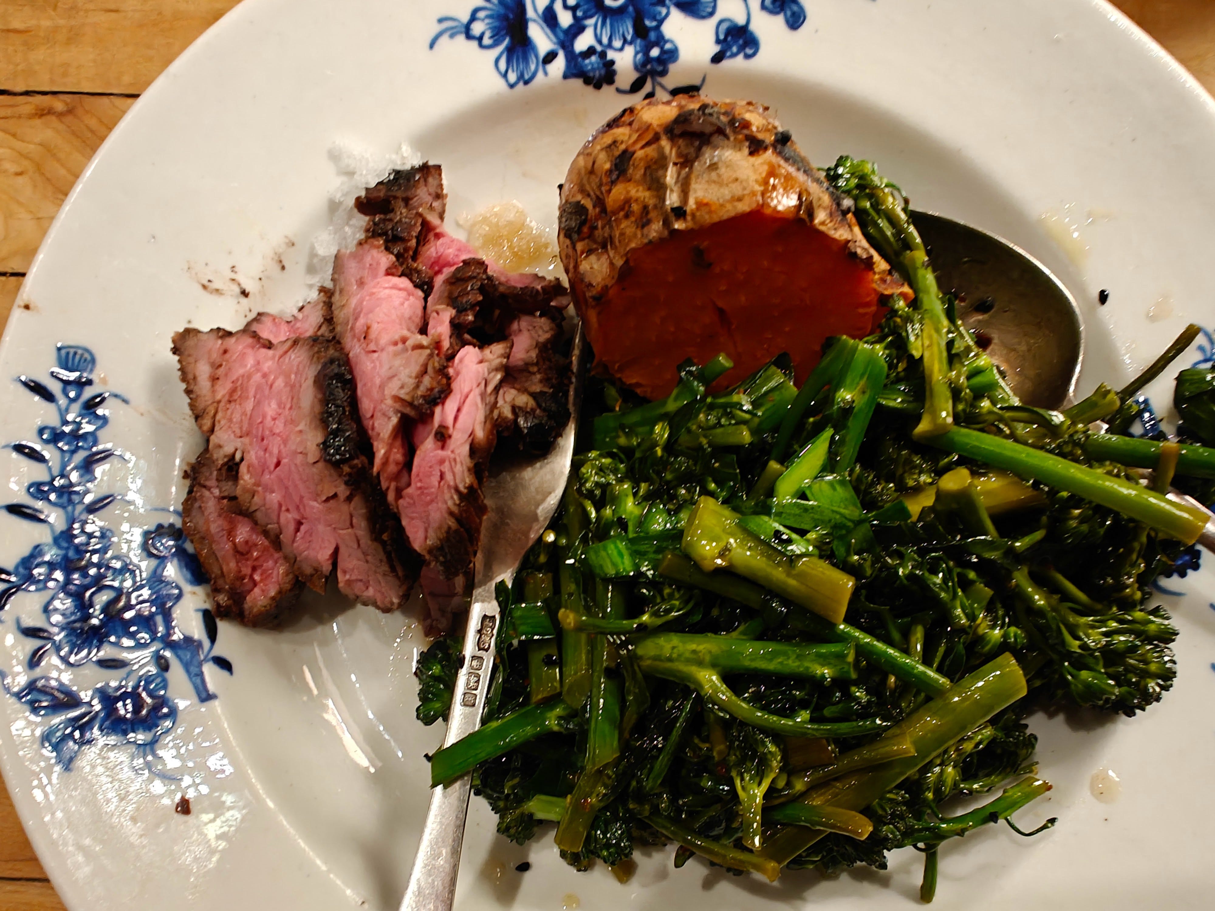 best arrival meal: slices of charcoal-grilled bavette with sweet potato and dressed greens