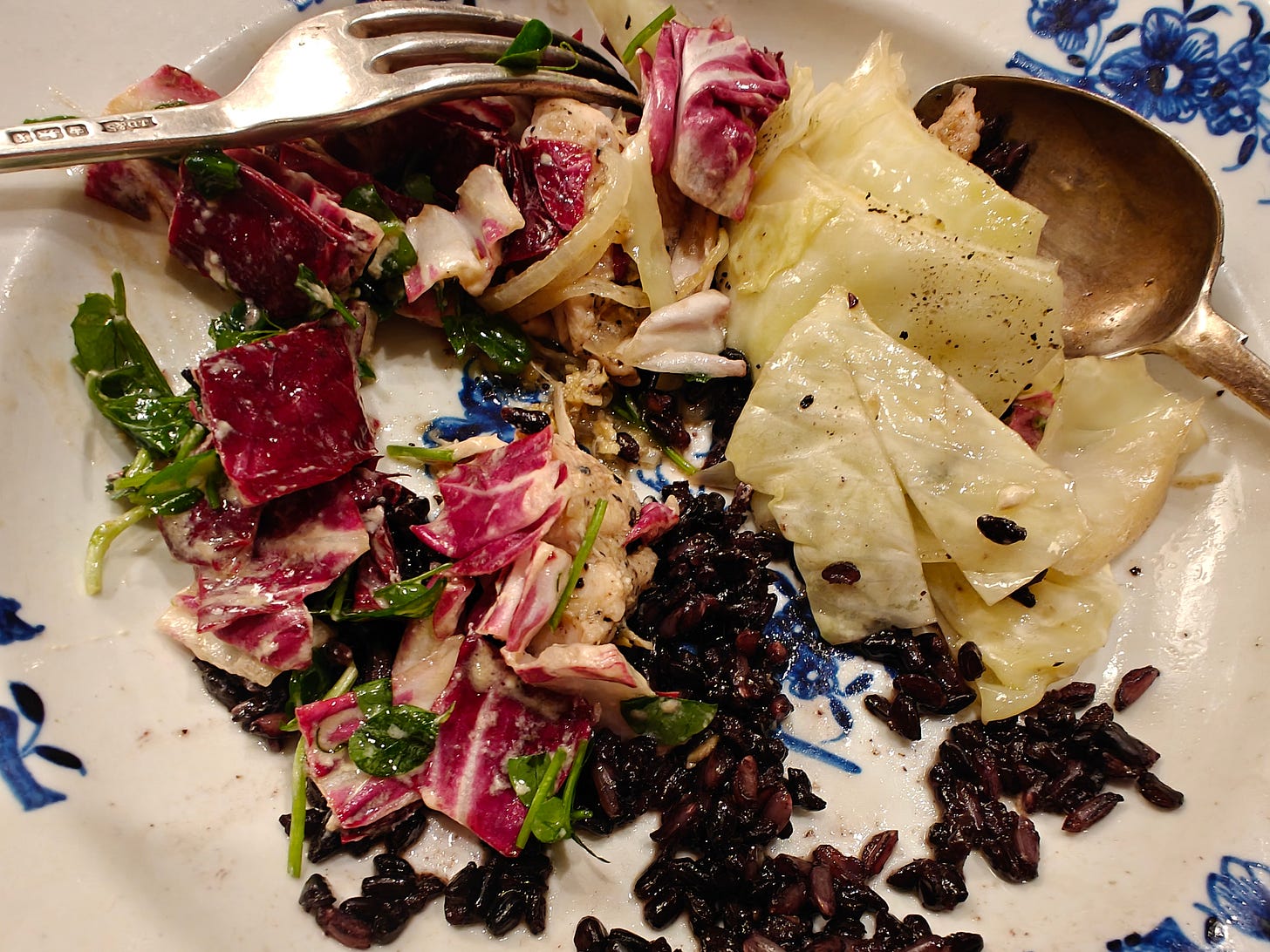 partway through supper: the radicchio and pea tendrils, the cabbage, and the black rice