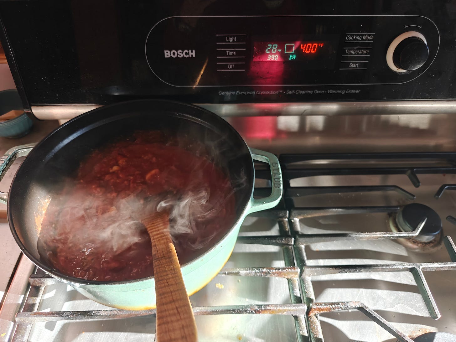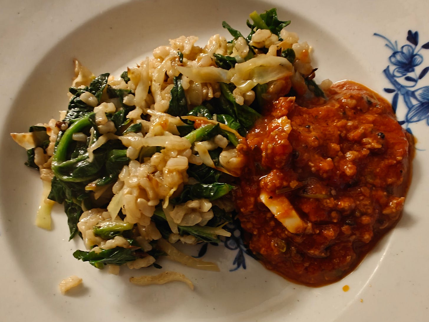 In the evening my patterns vary. This week I made a meat sauce for pasta (whole wheat fusilli). I started with mustard seeds, nigella, and cumin seeds in hot olive oil, then about 5 crushed garlic cloves and two red bird chiles, and finally a pound of Andreas’s ground lamb from Wychwood Market. I stirred it in, breaking up clumps, and soon it had all changed colour. I added most of a bottle of passata plus a chopped up large out-of-season tomato that I’d bought days earlier in a fit of bad judgement. The pot simmered gently for a good while to a lush texture, seasoned with a splash of fish sauce and some salt (I usually work with 1 teaspoon salt per pound of meat, then adjust the seasoning to taste once the sauce has cooked awhile).