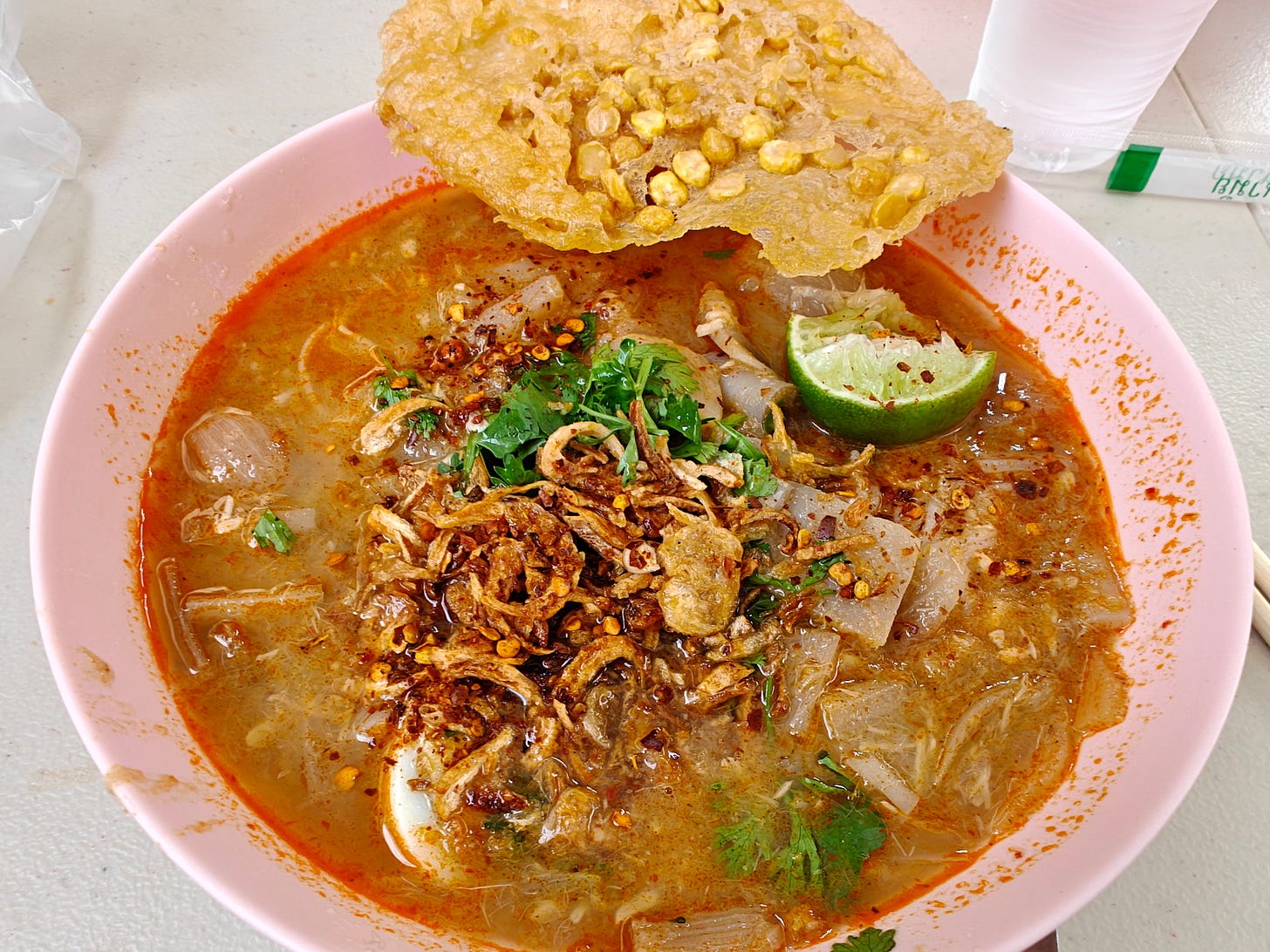 the bowl of mohinga, with the bean cracker still to be broken up and sprinkled on