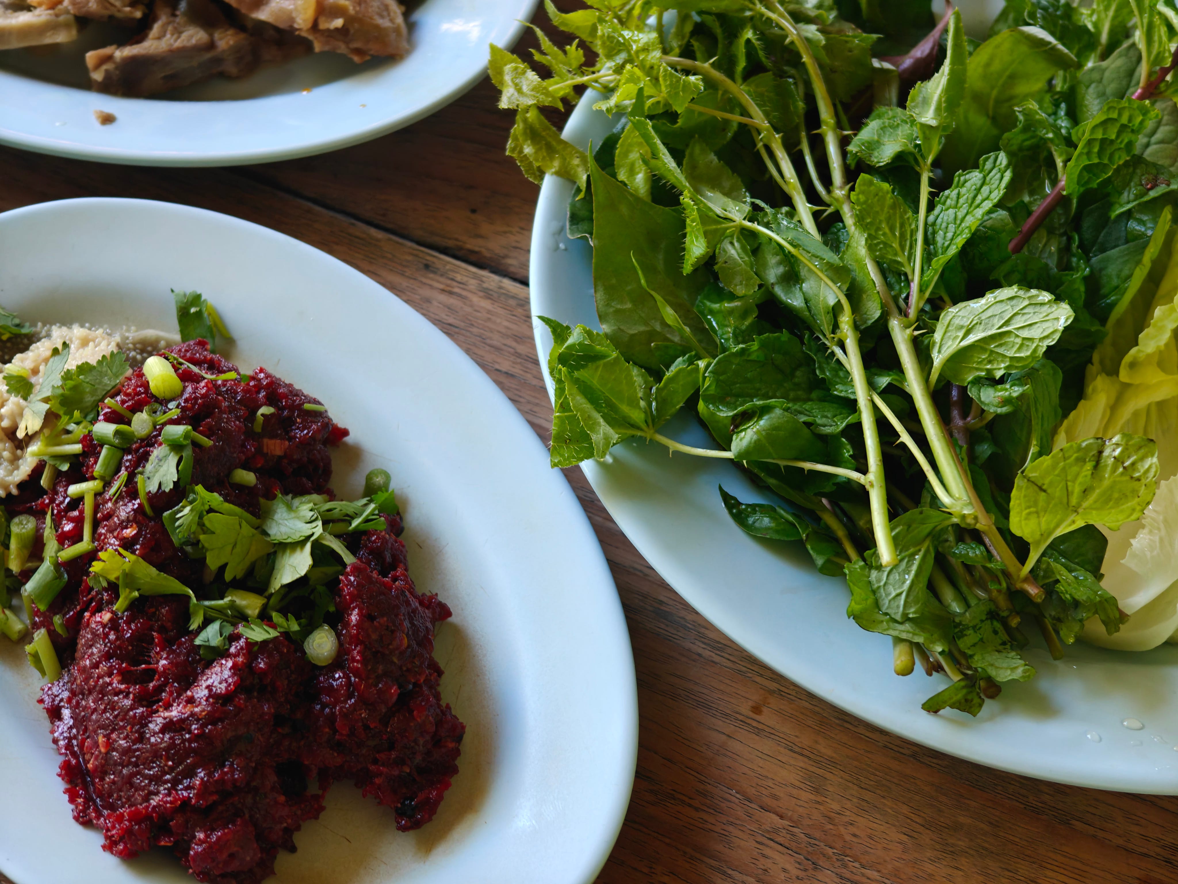 We ate our way through a mound of beef laab, picking up a leaf of one of the herbs and some sticky rice with each mouthful. The texture of the meat was remarkable, both pasty and firm, a little sticky, a little elastic. And the flavours were subtle and delicious