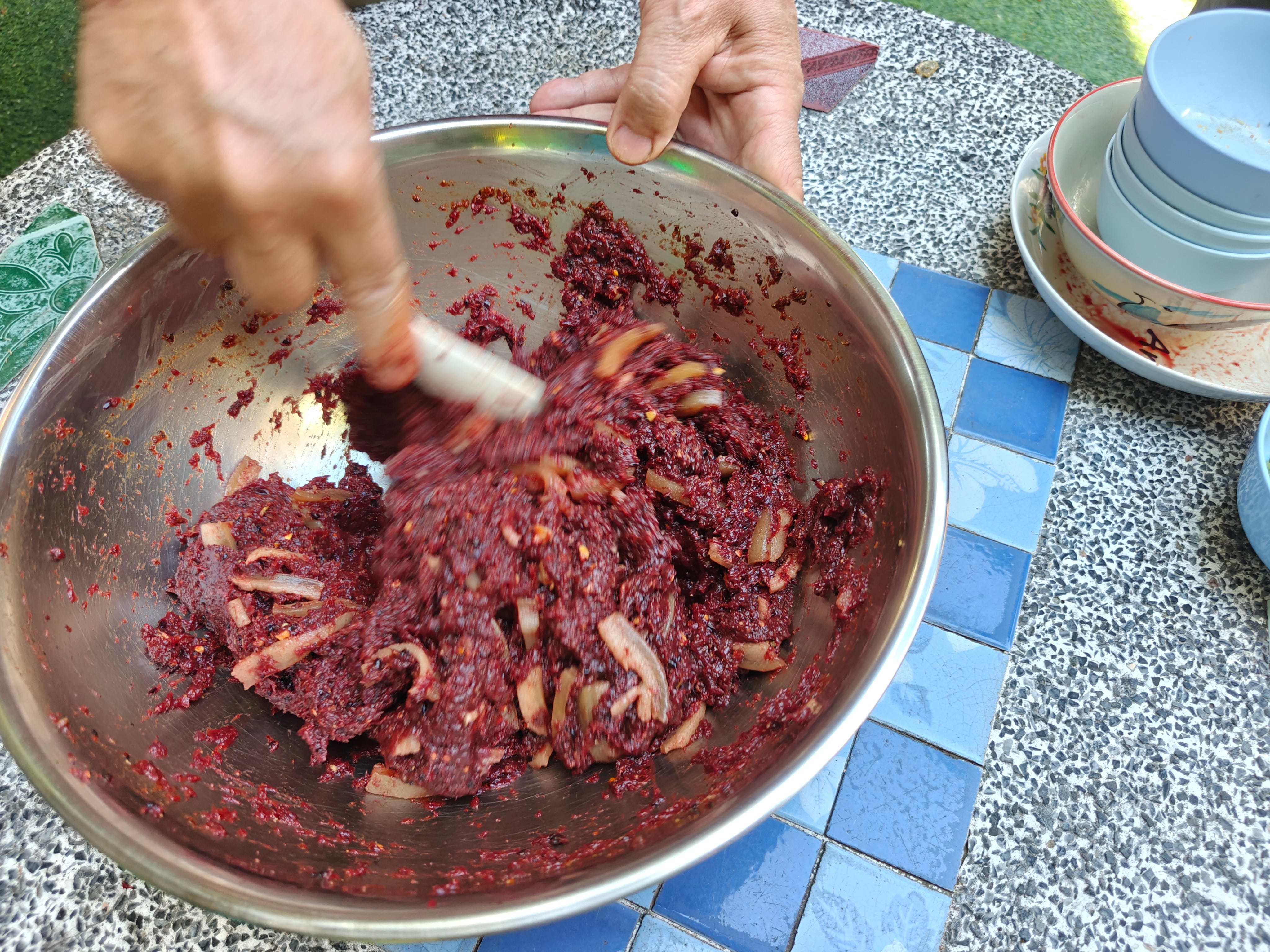 After we’d eaten our host showed us how to mix pork laab. The spices, powdered chile, and salt were briskly stirred into a warm broth with some boiled pork skin until they had fully dissolved. Then the mass of finely chopped meat and blood was added and massaged with a wide spoon for over five vigorous minutes until everything was beautifully blended