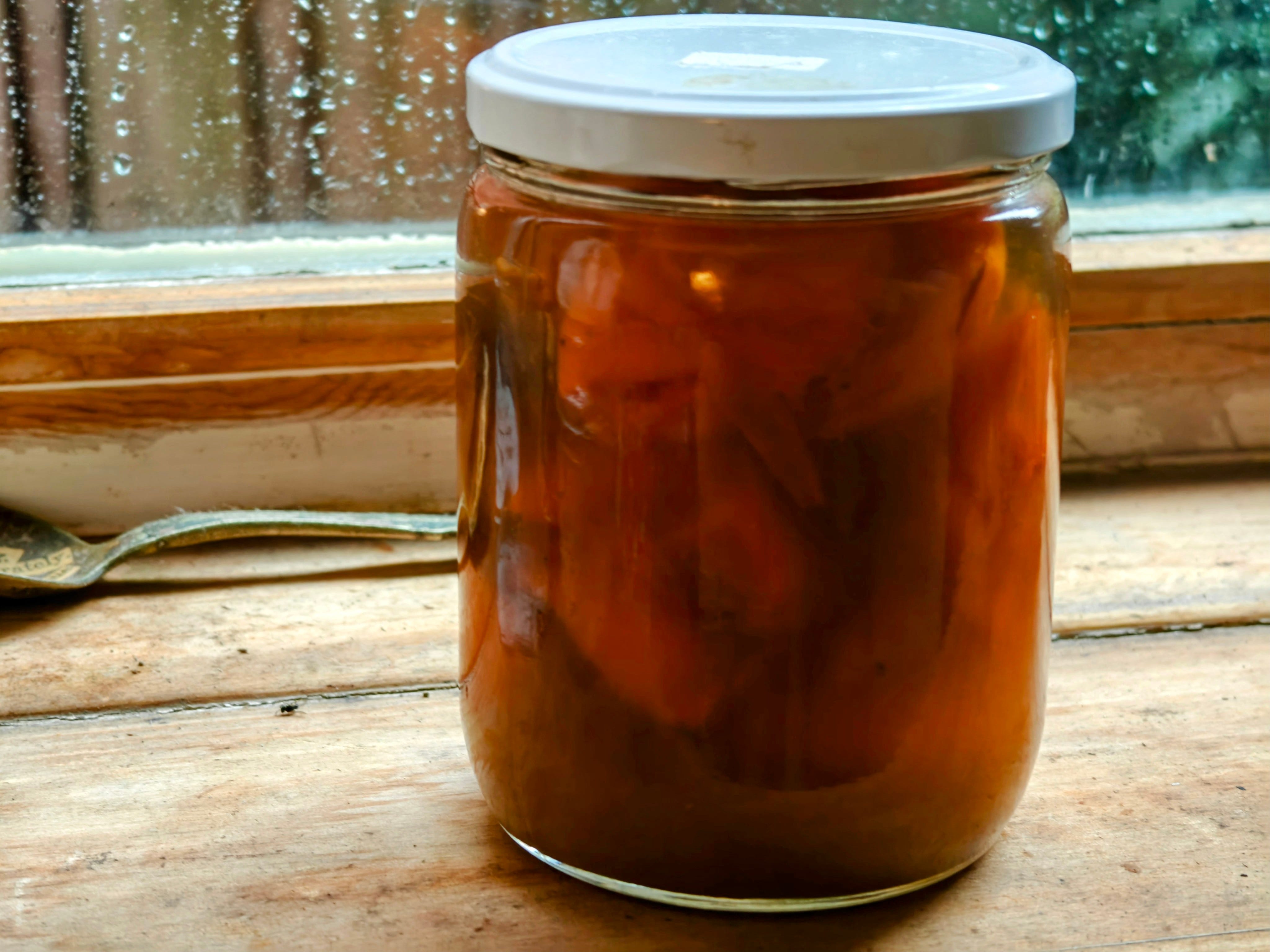 The intensification of flavour when I lightly stewed apricots earlier this month led me to repeat the process with some of the apricots I bought very early last Saturday morning at Wychwood Farmers’ Market before going to the singing. They went (cut in half) into a heated sugar and water mix (too light and thin to call a syrup, really) and simmered briefly. Here they are in a jar, a precious stash for later.