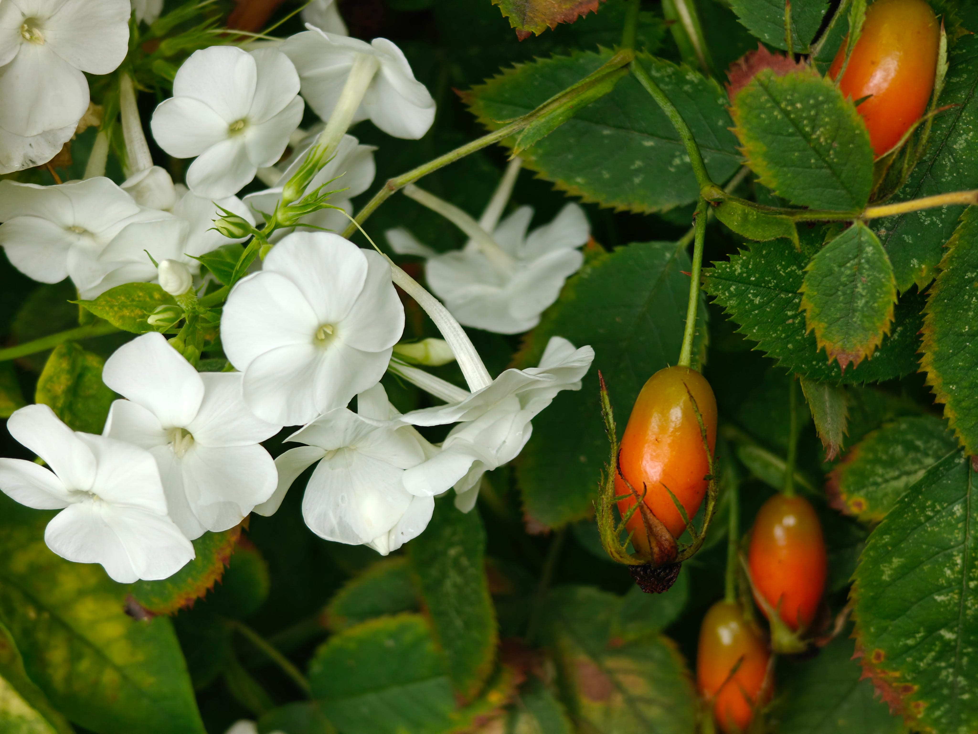 glowing rosehips, next to phlox, so aromatic in the evening.