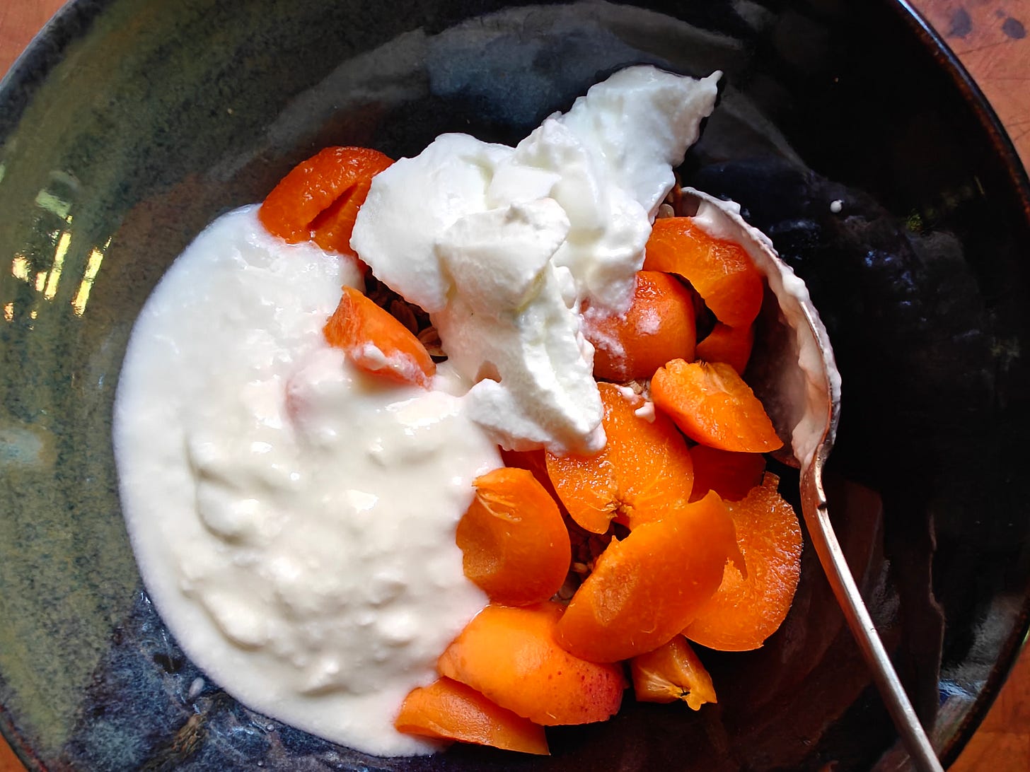 I somehow failed to make a photo of the skillet cakes. How did that happen? So here’s a reminder of them, a breakfast of apricots, kefir, and buffalo yogurt, tart-acid fruit with the fermented tart-sour of the kefir and the yogurt.
