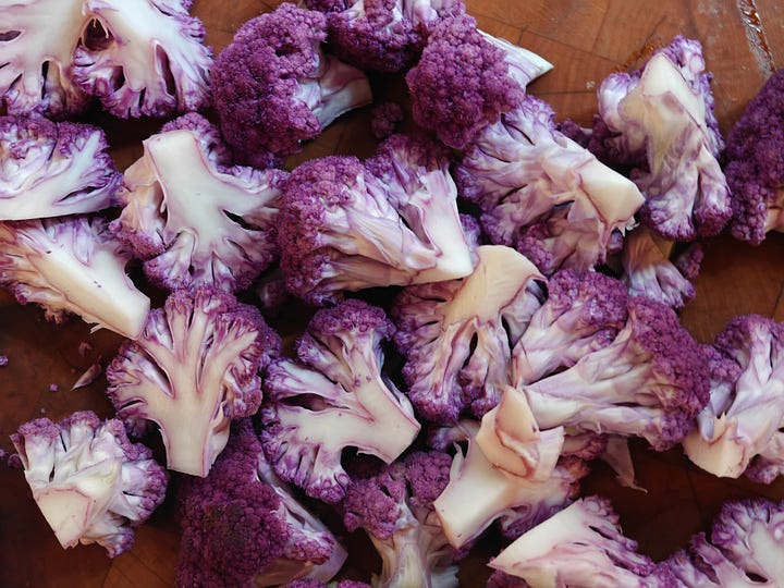 The intense colours of fruits and vegetables at this time of year can lift the heart: local purple cauliflower cut into florets, and one large local tomato chopped and dressed with basil, olive oil, and salt.