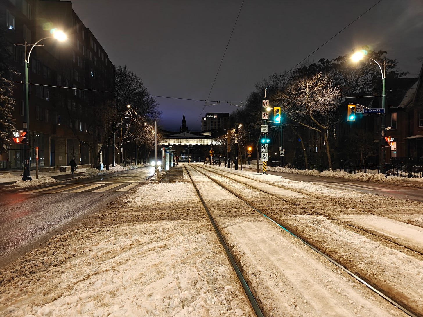 crossing streetcar tracks on a cold snowy night, Spadina Avenue
