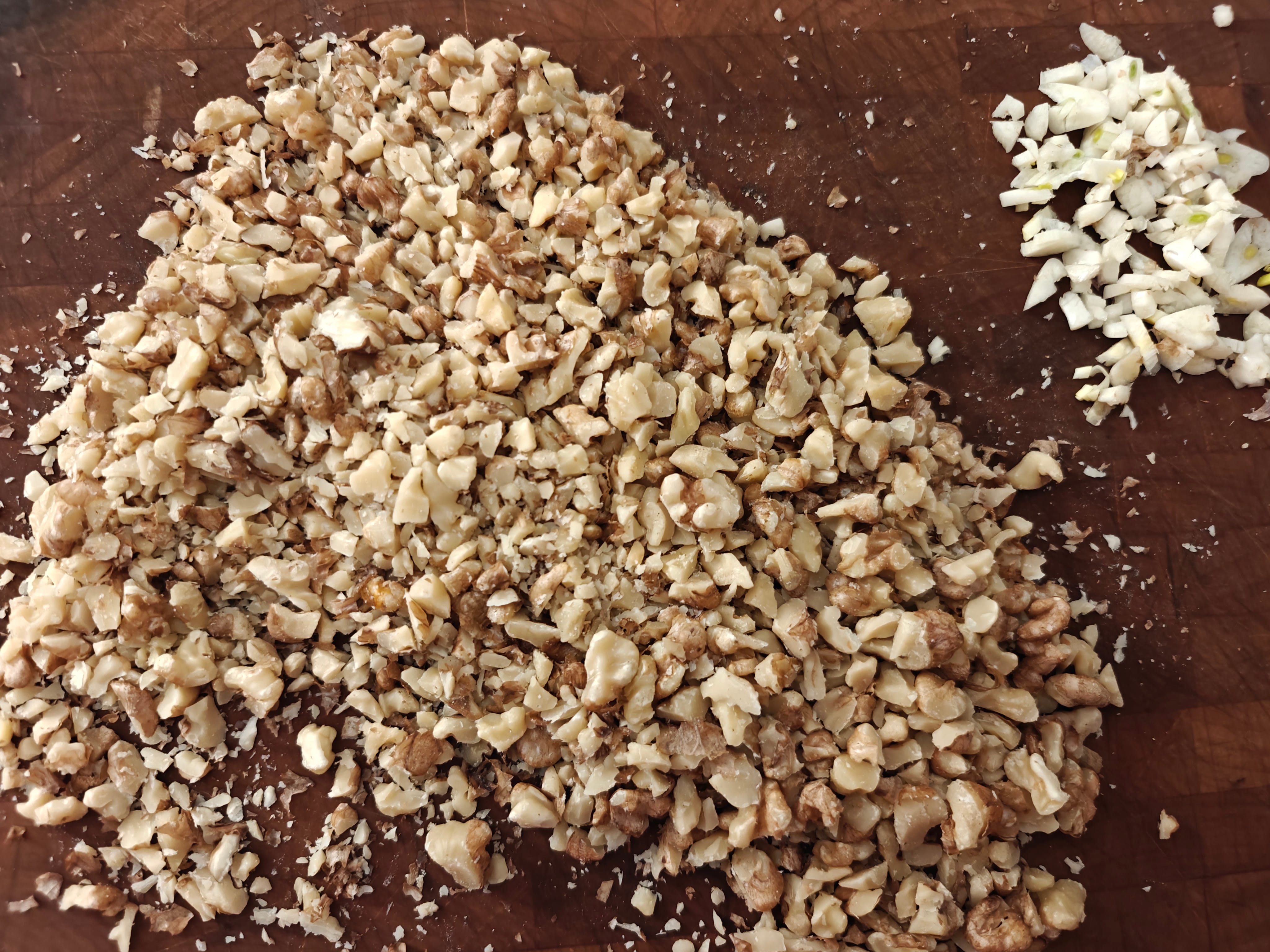 chopping a pile of walnuts, and garlic too
