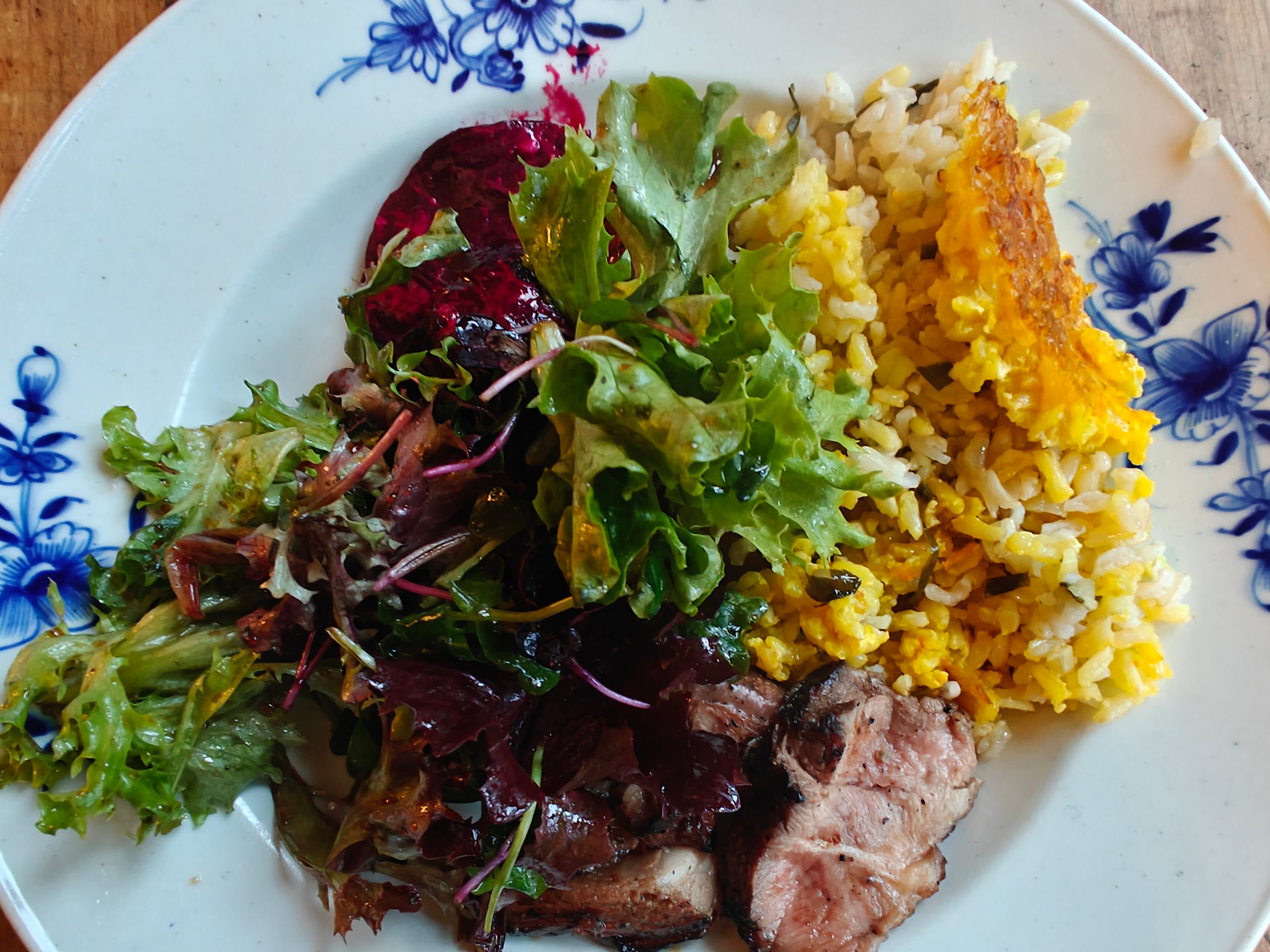 salad, polo with tahdig, beets, and grilled lamb; an assertion of spring
