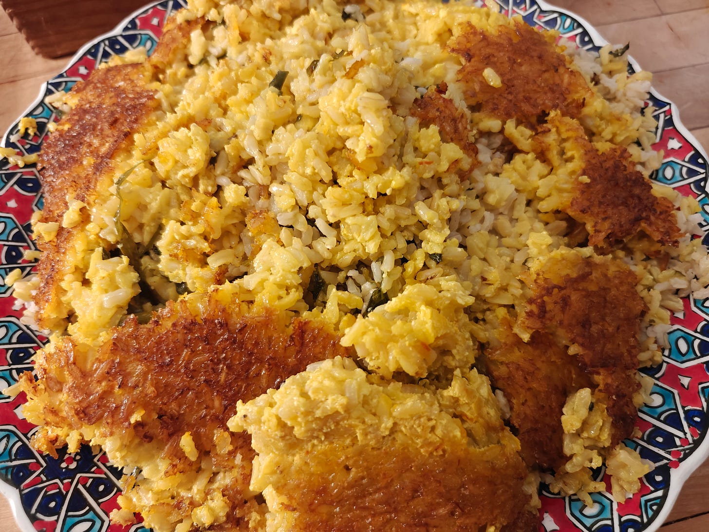 I prefer making a crust (tahdig) with a mix of yogurt and an egg, so in a bowl I stirred together a scant cup of plain full fat yogurt with one egg. Once the rice was softer but not cooked through (it took more than half an hour), I drained it in a sieve in the sink. I scooped about 1 1/2 cups of the drained rice into the bowl of yogurt, stirred to mix it all together, then added the saffron water.