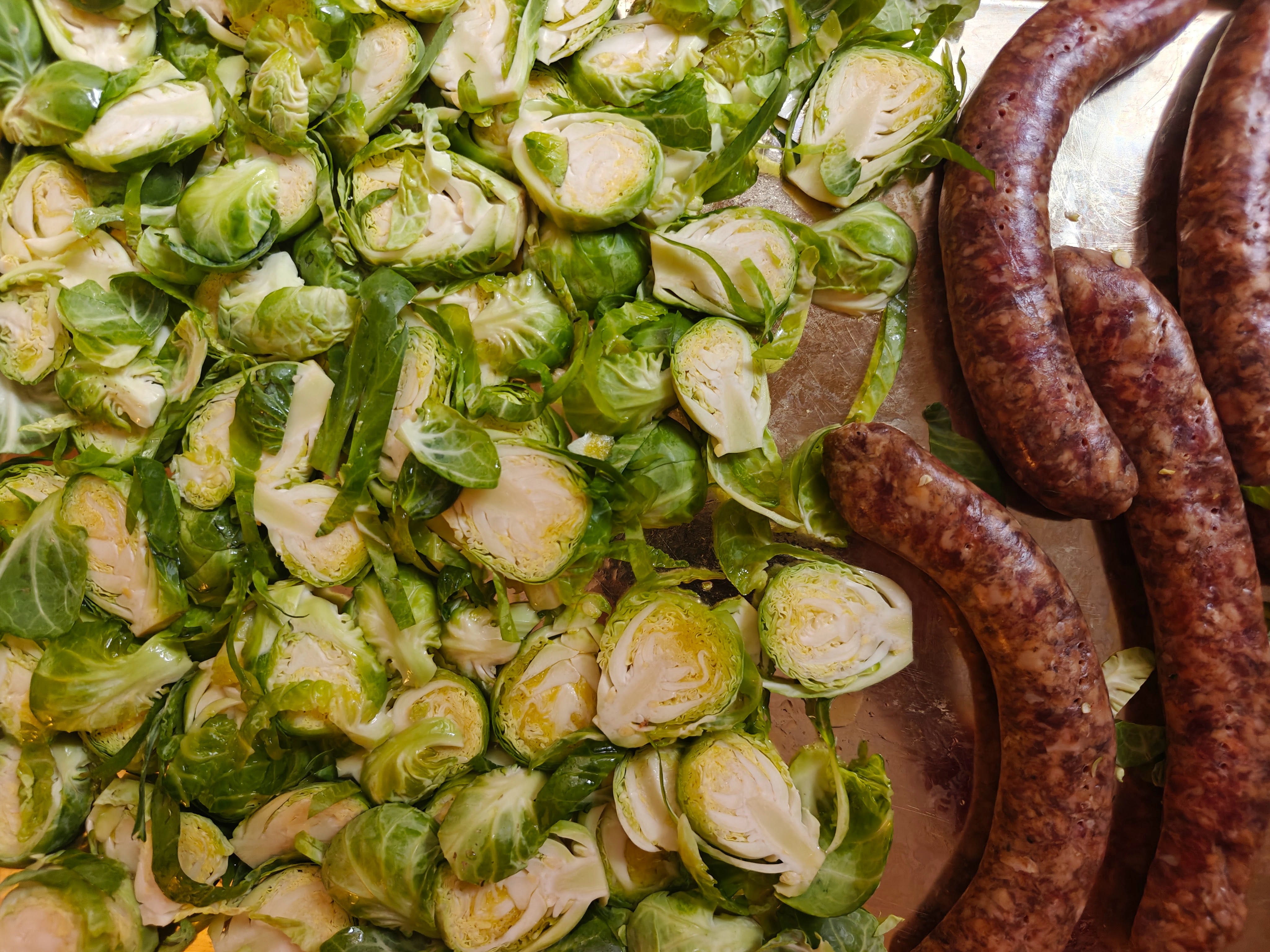 As often happens, one happy discovery arose because one night I was stuck with no good plan for supper, and then an idea for improvising turned out to be solid gold. Here’s how it went: I had brussels sprouts and I had taken a small package of merguez out of the freezer. Merguez are (delicious) Moroccan-Algerian style spiced lamb sausages, and these came from our friends at Black Sheep Farm in Grey County. The weather had turned cold and snowy for the umpteenth time this month, so oven-roasting seemed like a good plan.