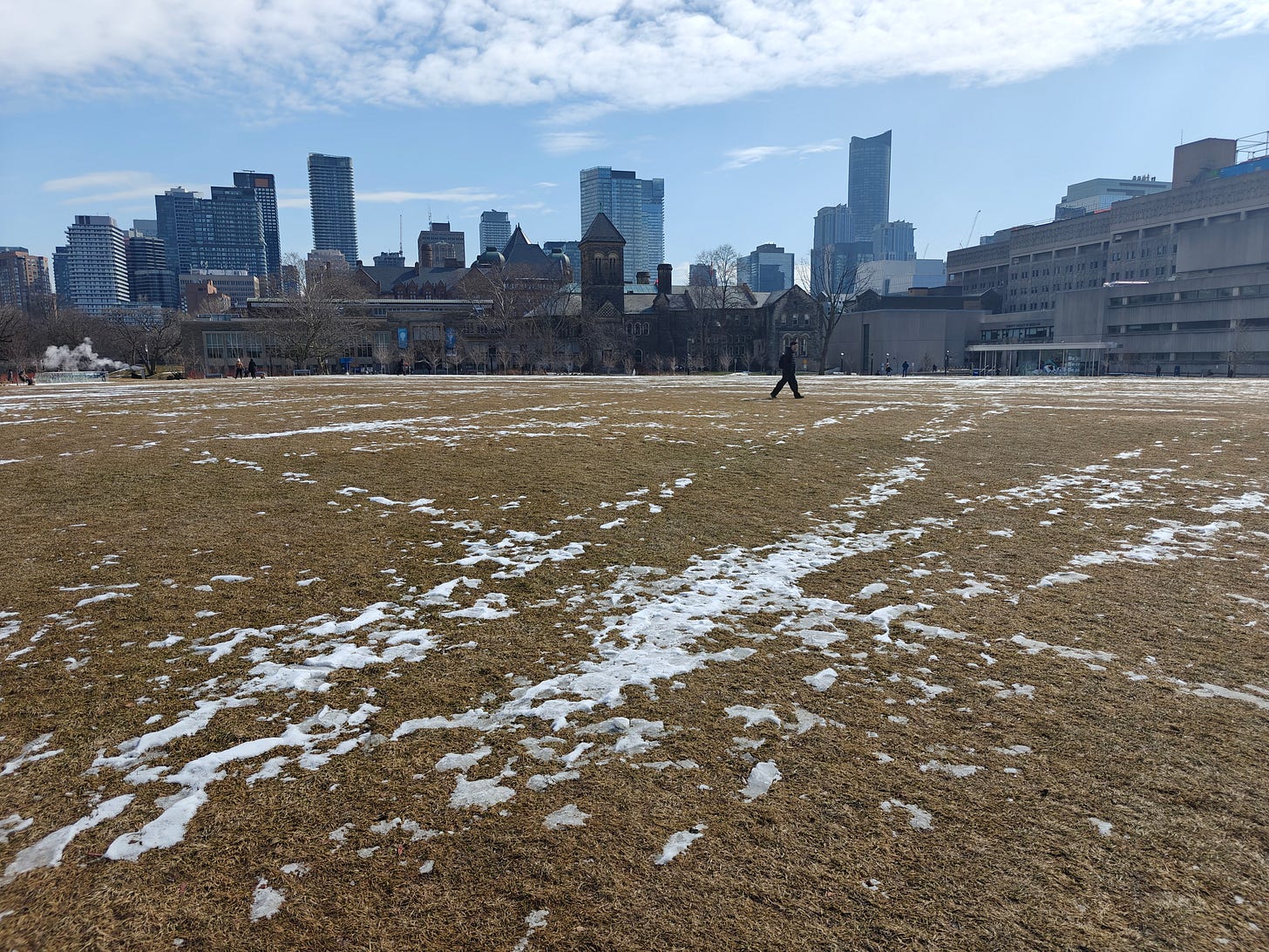 the traces of winter are slowly fading; remnants of paths across Kings College Circle at the University of Toronto