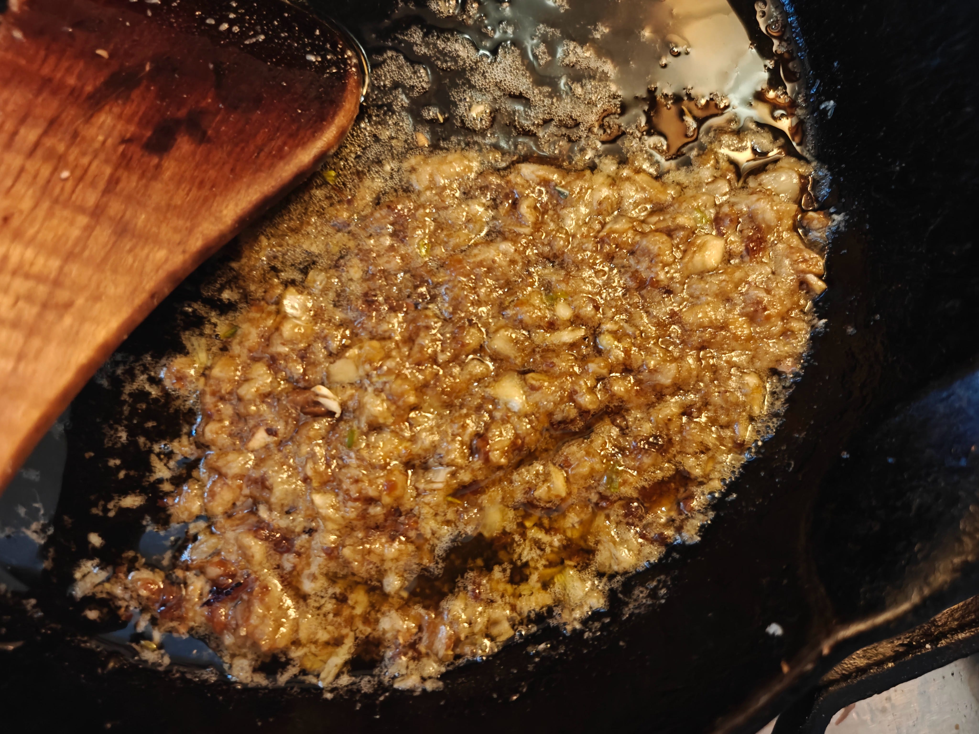 I chopped the garlic and anchovy, cooked them in olive oil in a large cast-iron skillet, mashing them with a spoon as they softened, then stirred in a generous amount of grated parmesan and black pepper.