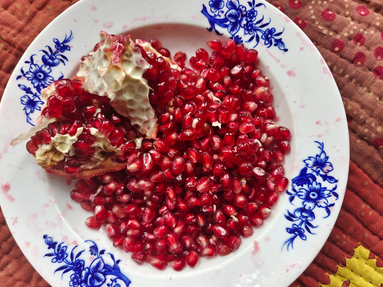 A dear friend brought me a pomegranate about a week ago. It’s been sitting round glowing pink-red, reminding me to open it up. So this morning, a couple of days early for Yalda, that’s what I did. If you’ve got a lot of pomegranates to strip, the task can seem tedious or onerous. But if, as I was, you are on your own with no deadline to meet, then it becomes wonderfully meditative.